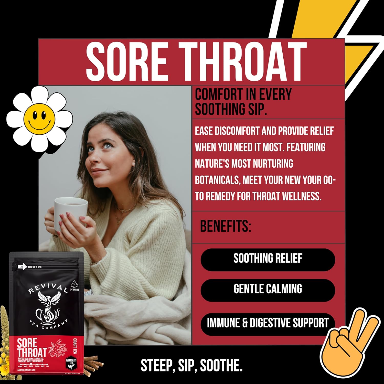 - Soothing Tea: We've crafted up the best sore throat soothing tea you can find. 12 all natural ingredients that will get your back up and running in no time. Say goodbye to your sore throat and say hello to a new staple in your tea collection!