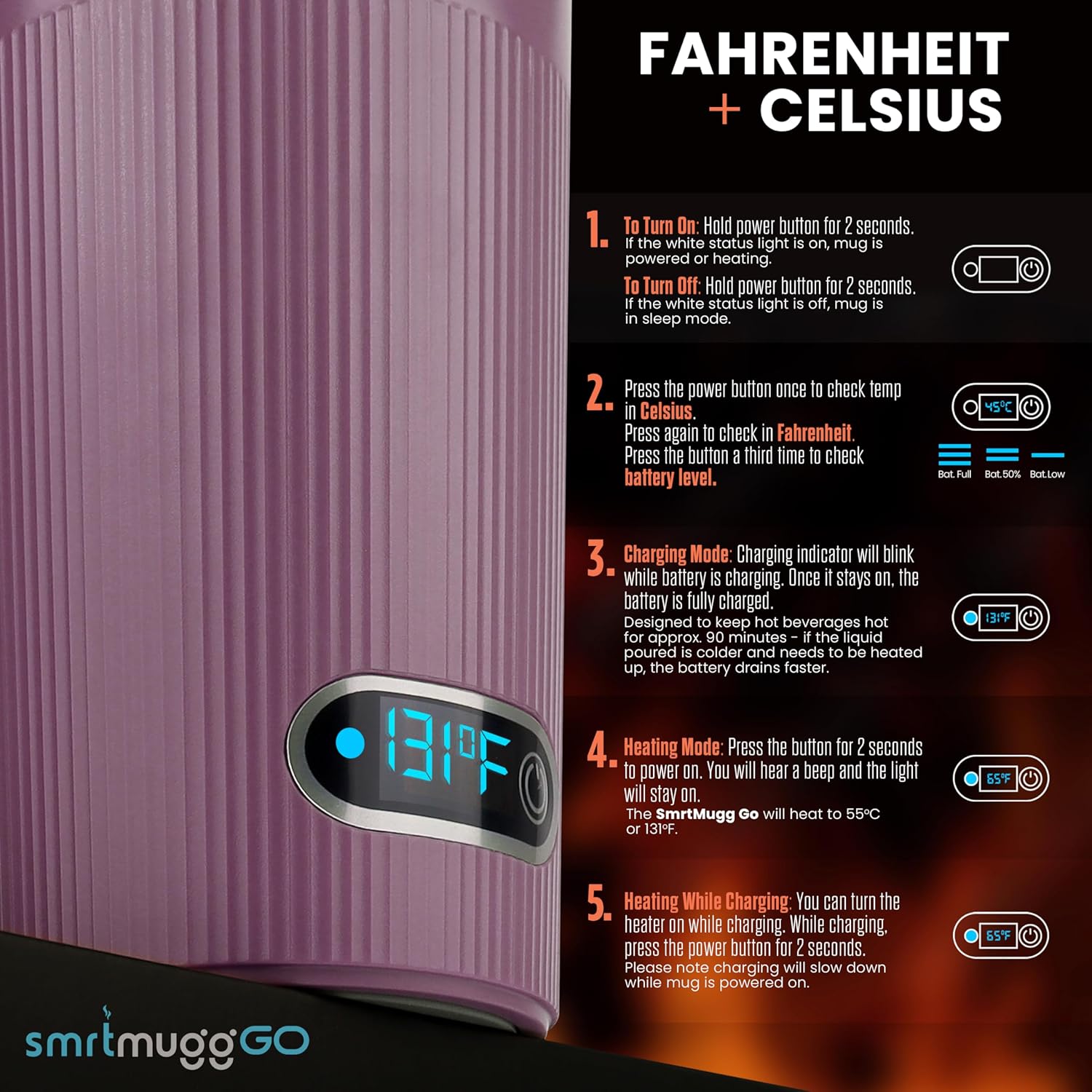 - ✅ Super Simple Operation. Simply press and hold the button to turn the mug on, and that's it! The SmrtMugg go's simple operation let's you quickly take your coffee on the Go.