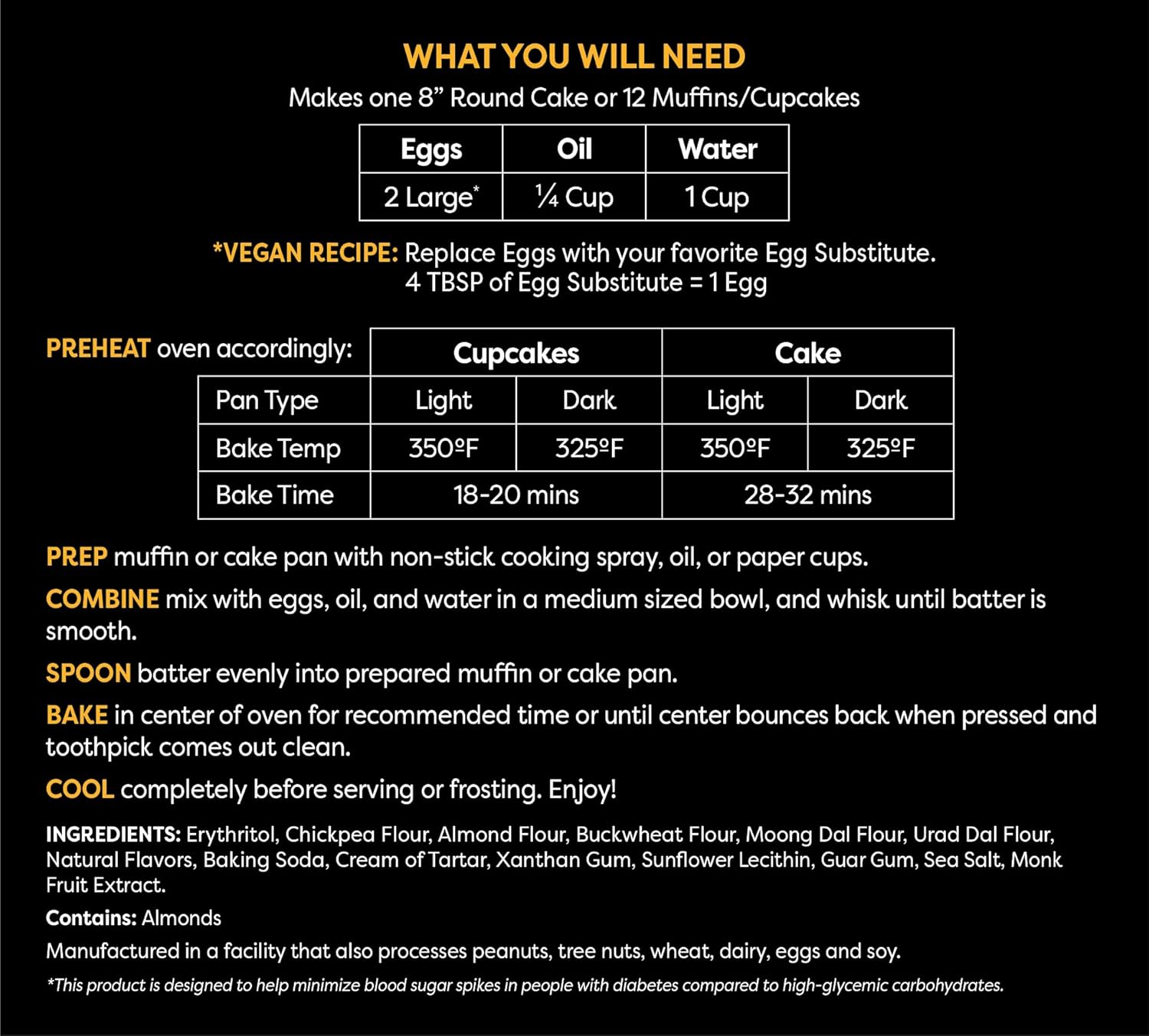 - Makes one 8” round cake or 12 muffins / cupcakes per package.