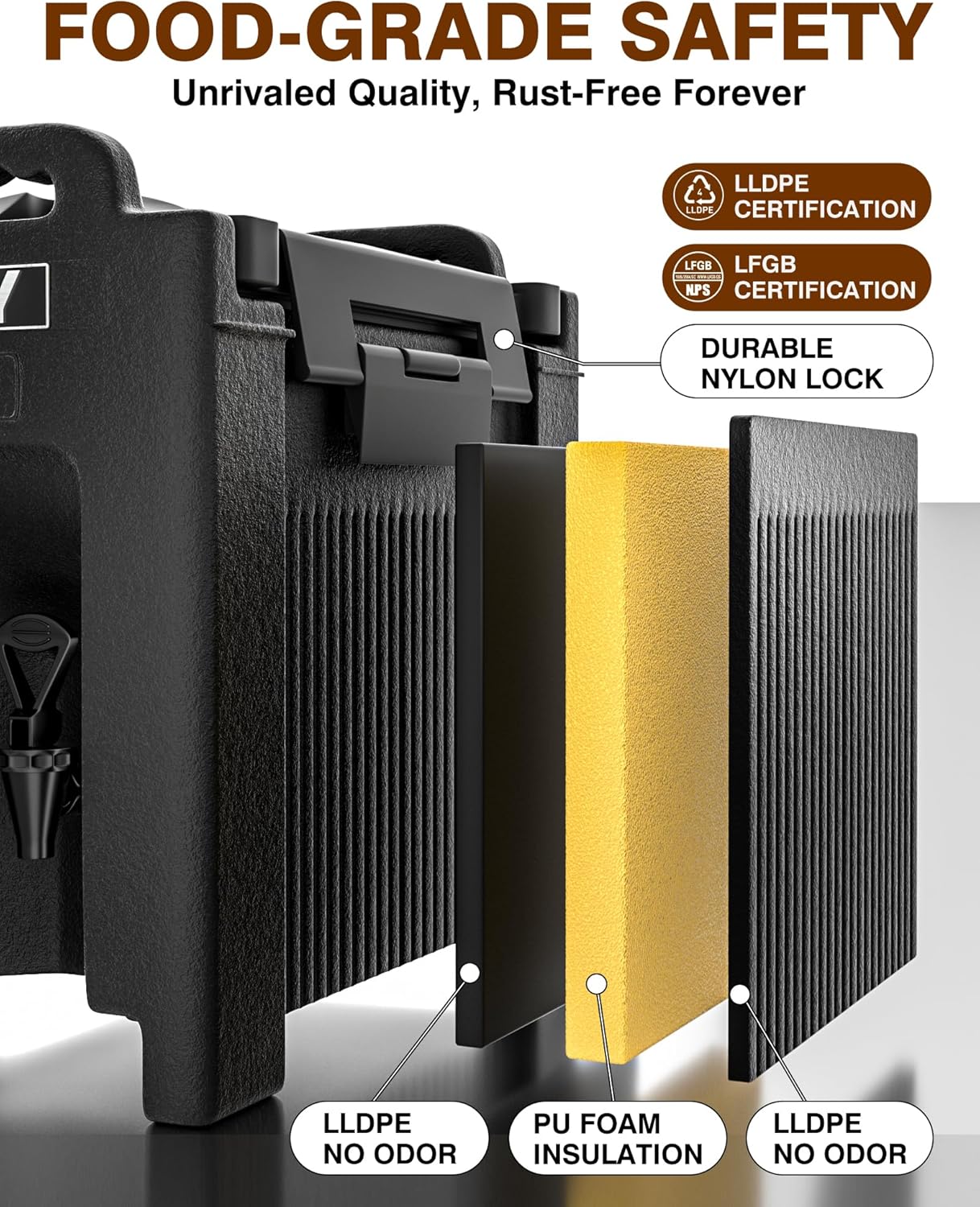 - MATERIAL SAFETY:Rest assured with our food-grade material LLDPE, offering excellent pressure resistance. Coupled with a 20mm PU insulation layer, it ensures your beverages stay fresh and at the desired temperature. Our insulated dispenser is LFGB certified, meeting strict standards for food contact material safety.