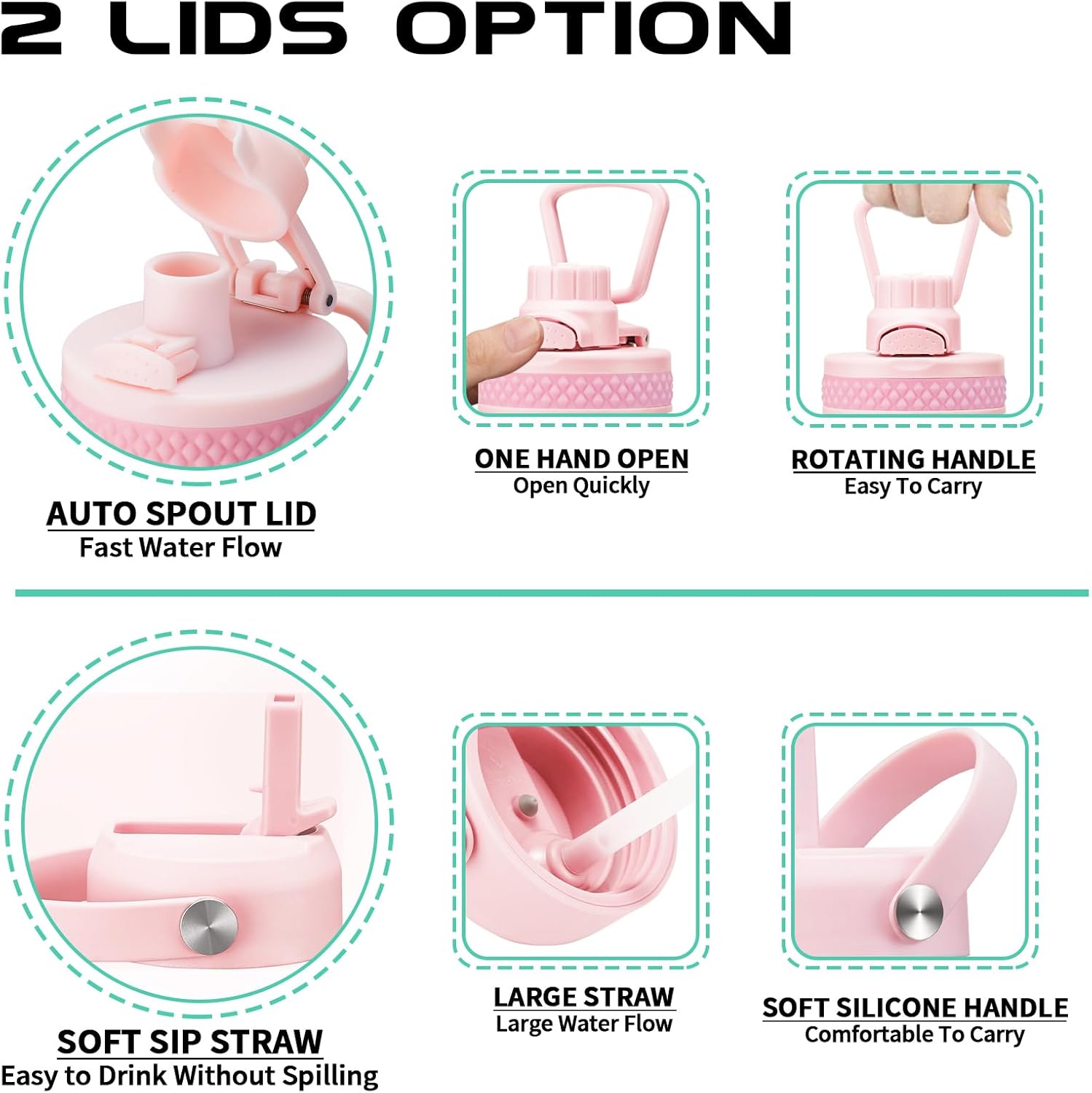 - 2 LEAKPROOF LIDS OPTIONS: The auto spout cap & straw lid provide your different drinking experience. The ONE-HAND operation pop-up spout lid for easy enjoy your fast water flow. The SPILL-PROOF straw lid with high flow rate & BPA free. Both 2 lids design with a sturdy handle, making the Hydrogen flask water bottle more convenient to carry