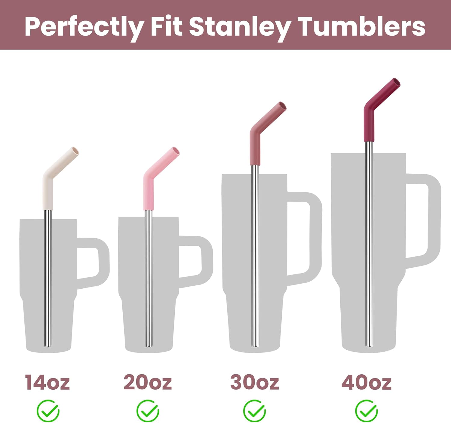 - Versatile Compatibility: Our stainless steel straw set is designed to perfectly fit a range of Stanley Quencher Tumblers, including the 40OZ, 30OZ, 20OZ, and 14OZ models. This ensures that regardless of the size of your tumbler, you have the ideal straw for your drinking needs, making our straws a must-have accessory for your favorite tumbler.