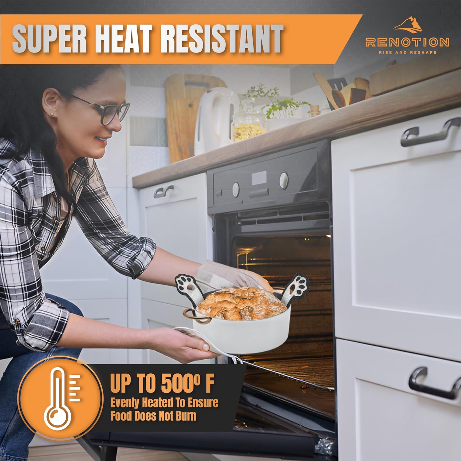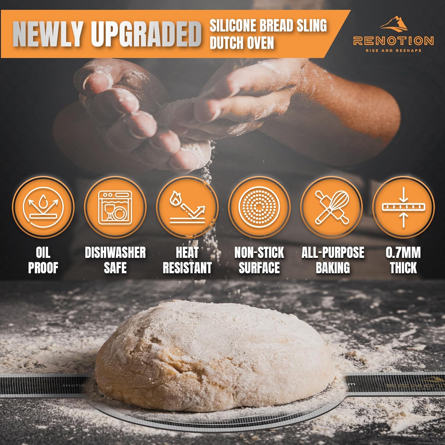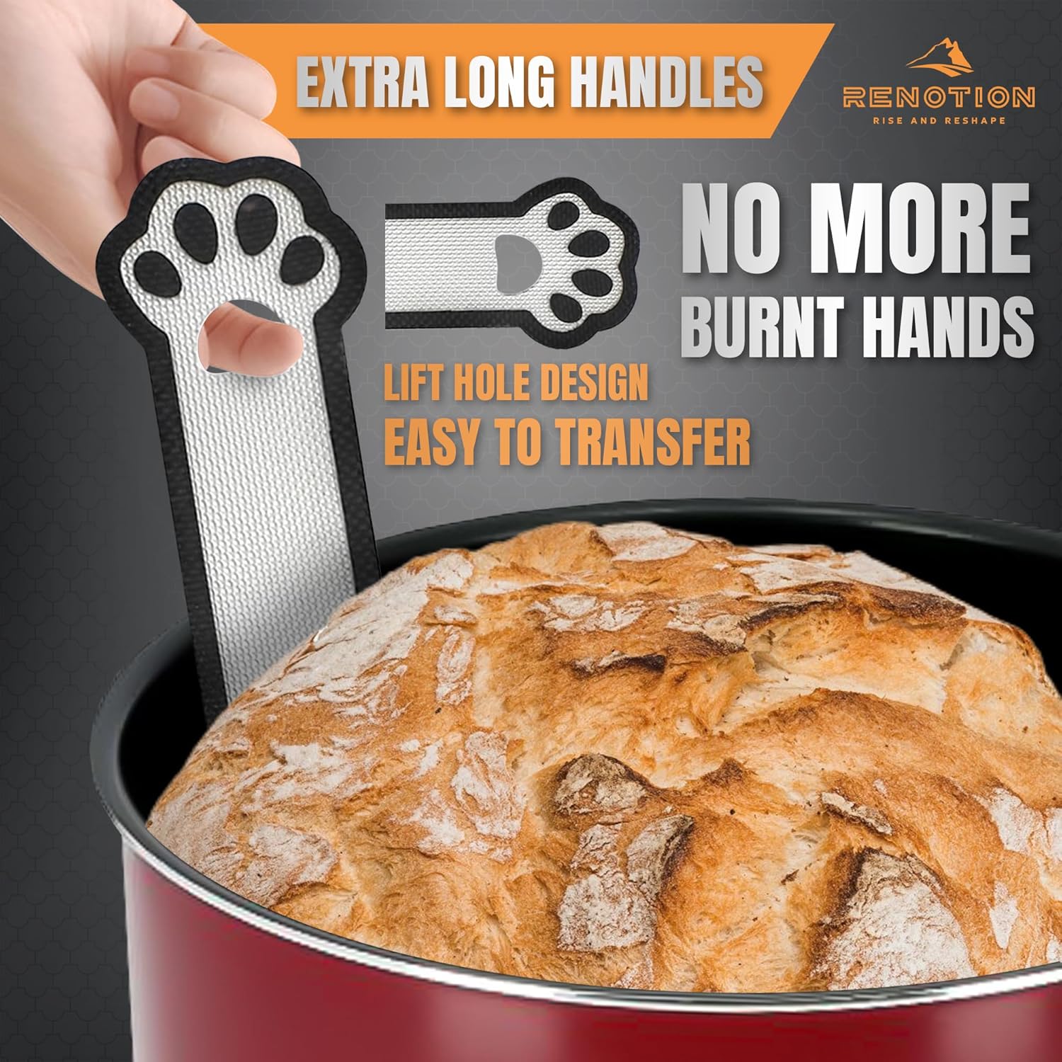 - 🌟 LONG HANDLE DESIGN 🌟 : Renotion silicone bread baking mat comes with extra long handles, so you can easily grab and move your sourdough bread from the hot oven to the Dutch oven pot without burning your hands. It's highly improved than those thin slings with short handles.
