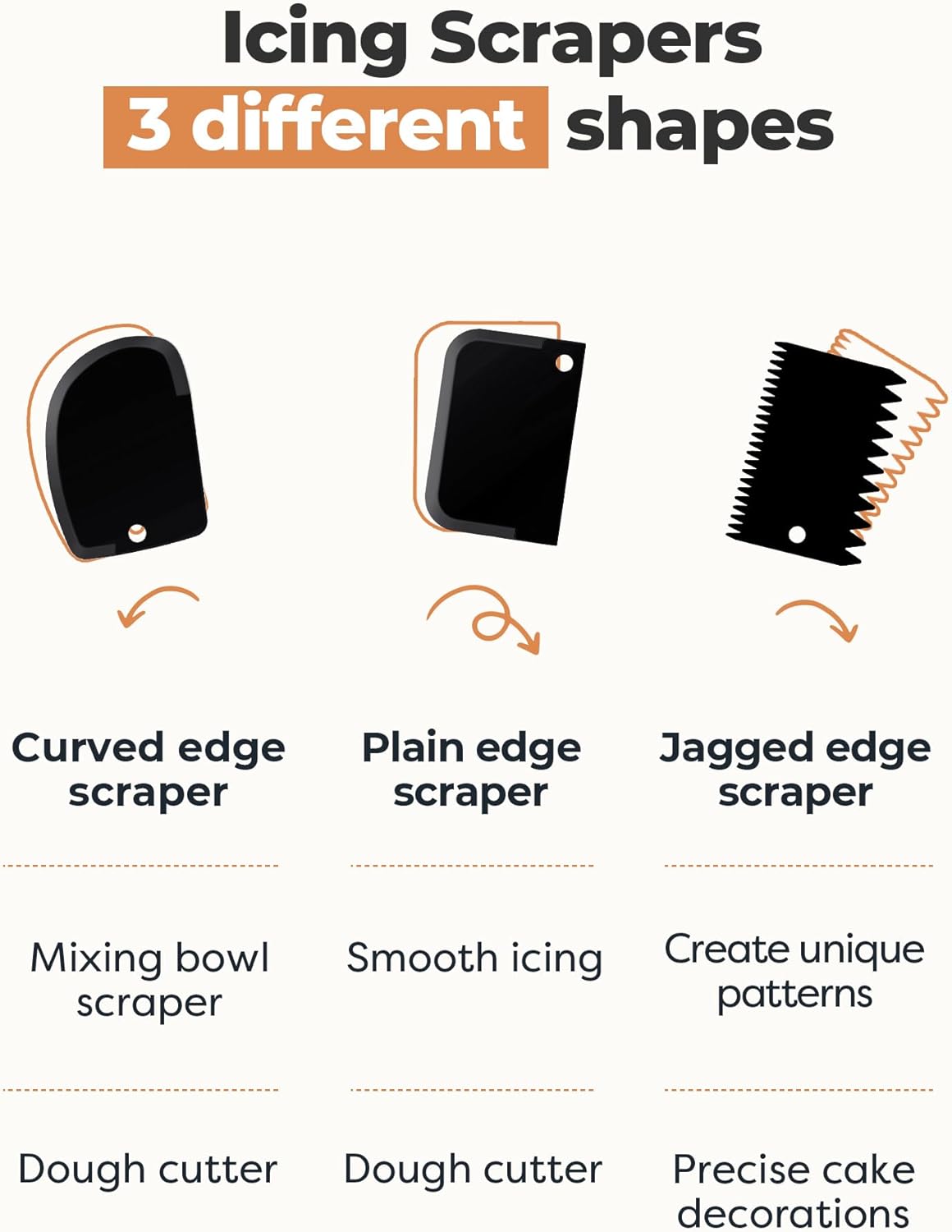 • 3 Edges of Cake Scrapers: This cake decorating set includes 3 different icing comb scrapers, so you can make various designs on your cake. With one rounded scraper, one straight scraper, and one toothed scraper, you can easily create complex and stunning designs.