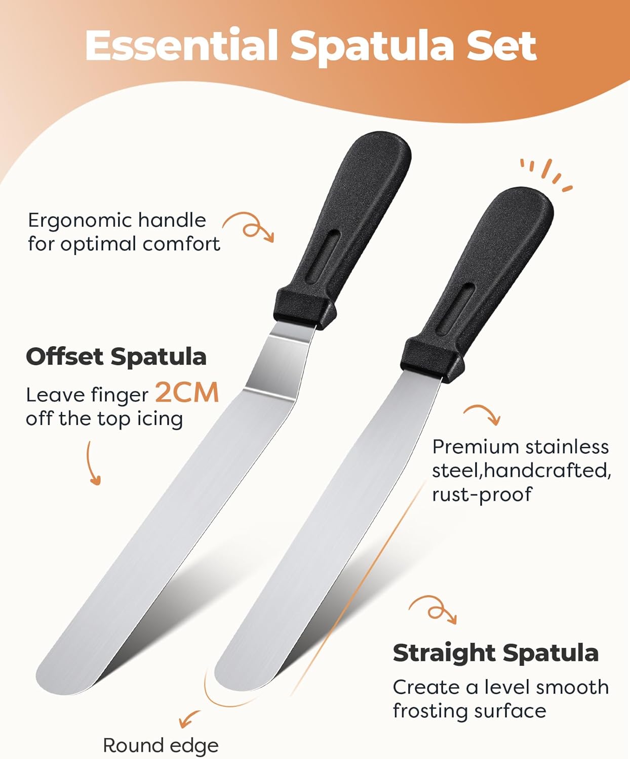 • Straight and Angled Frosting Spatulas: These high-quality stainless steel frosting spatulas make it easy to even out frosting and work on layered cakes. With a 12.5-inch angled spatula and a 10.6-inch straight spatula, you can create even crumb layers and perfect surfaces.