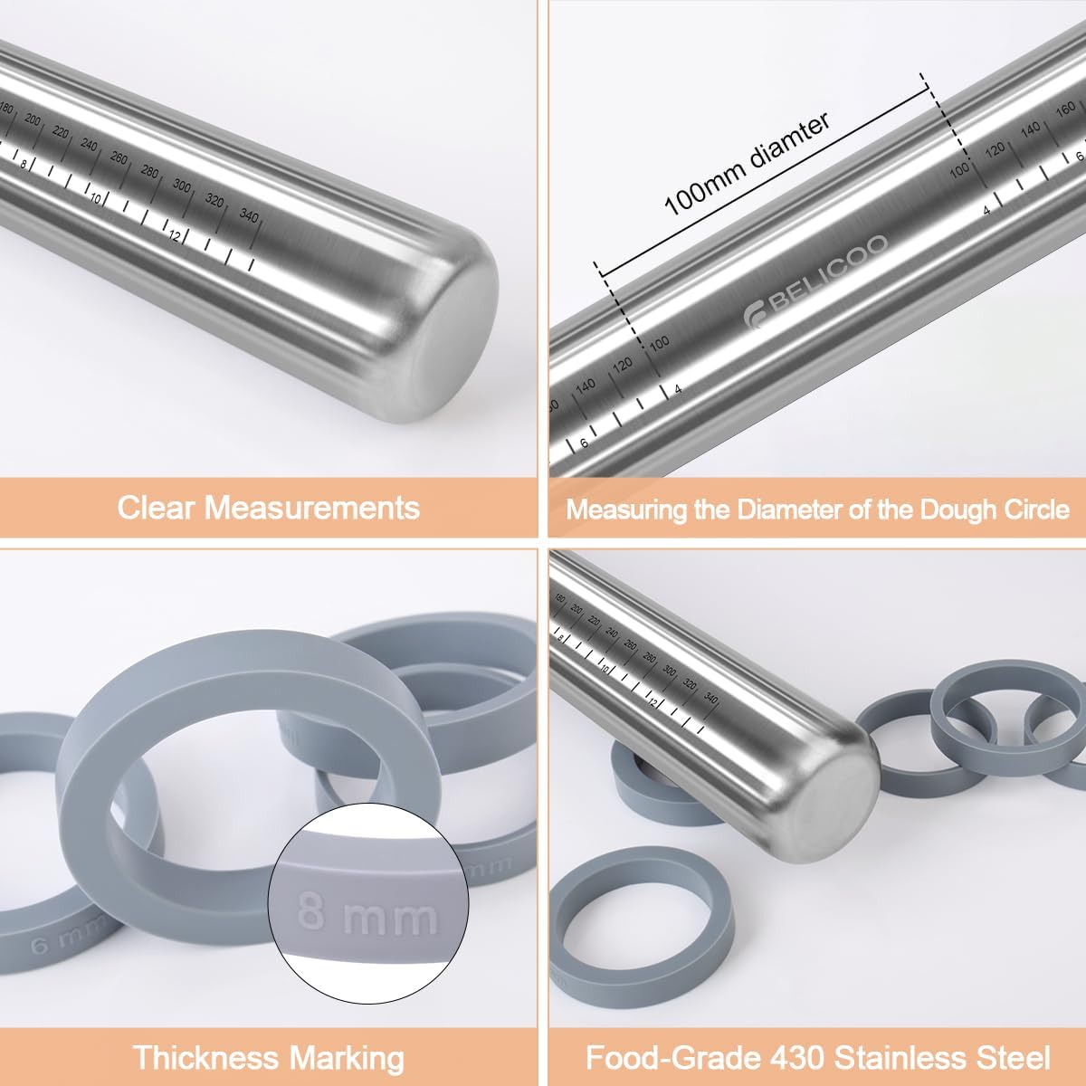 - 【Perfect Set】The set includes a 16.1-inch (40cm) food grade stainless steel rolling pin, four sizes (2mm/4mm/6mm/8mm) adjustable detachable rings, a silicone pastry pad with size, and a food grade silicone brush. A complete set of tools makes cooking and baking easier and more enjoyable for you.