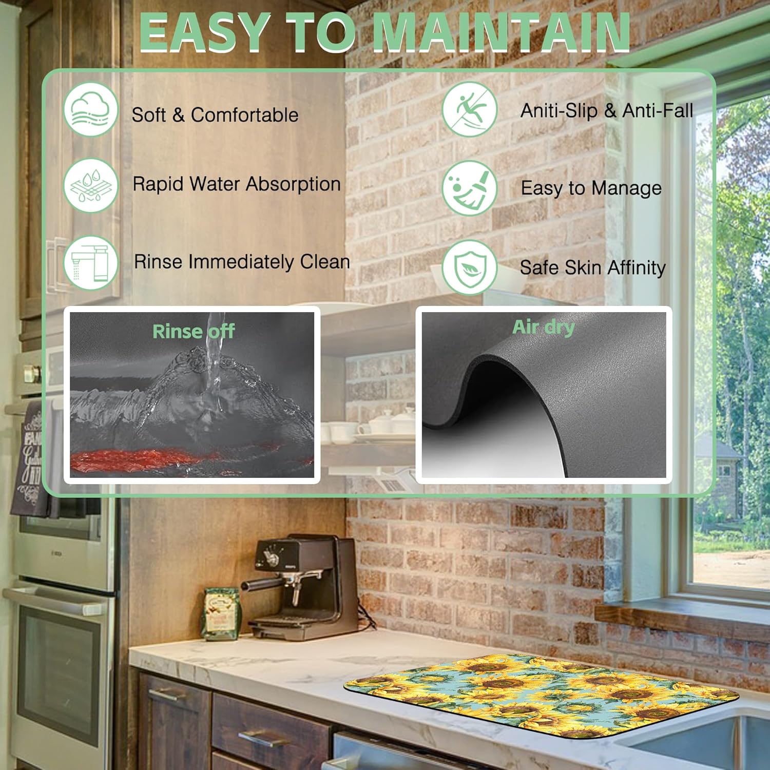- 【Hide Stains & Easy to Clean】Our dish drying mat, the surface material porosity is up to 85%, which can quickly absorb stains. The dish drying mat can be washed by hand or machine to remove stains, it will not fade after repeated washing, and can be reused many times, due to the high-definition printed suede with excellent color locking effect, please do not use bleach to clean the mat.