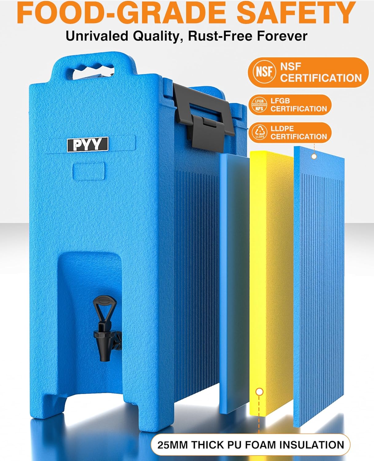 - MATERIAL SAFETY:Rest assured with our food-grade material LLDPE, offering excellent pressure resistance. Coupled with a 20mm PU insulation layer, it ensures your beverages stay fresh and at the desired temperature. Our insulated dispenser is LFGB certified, meeting strict standards for food contact material safety.