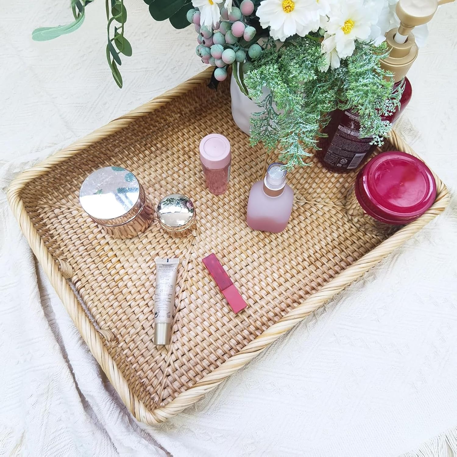 - Widely Applicable Rattan Organizers Storage Basket: Retro brown and suitable size boho decorative tray is perfect for the kitchen, lobby, party, cocktails, office, coffee table, or bedroom to organize bread, fruit, towel, soap, other odds and ends.