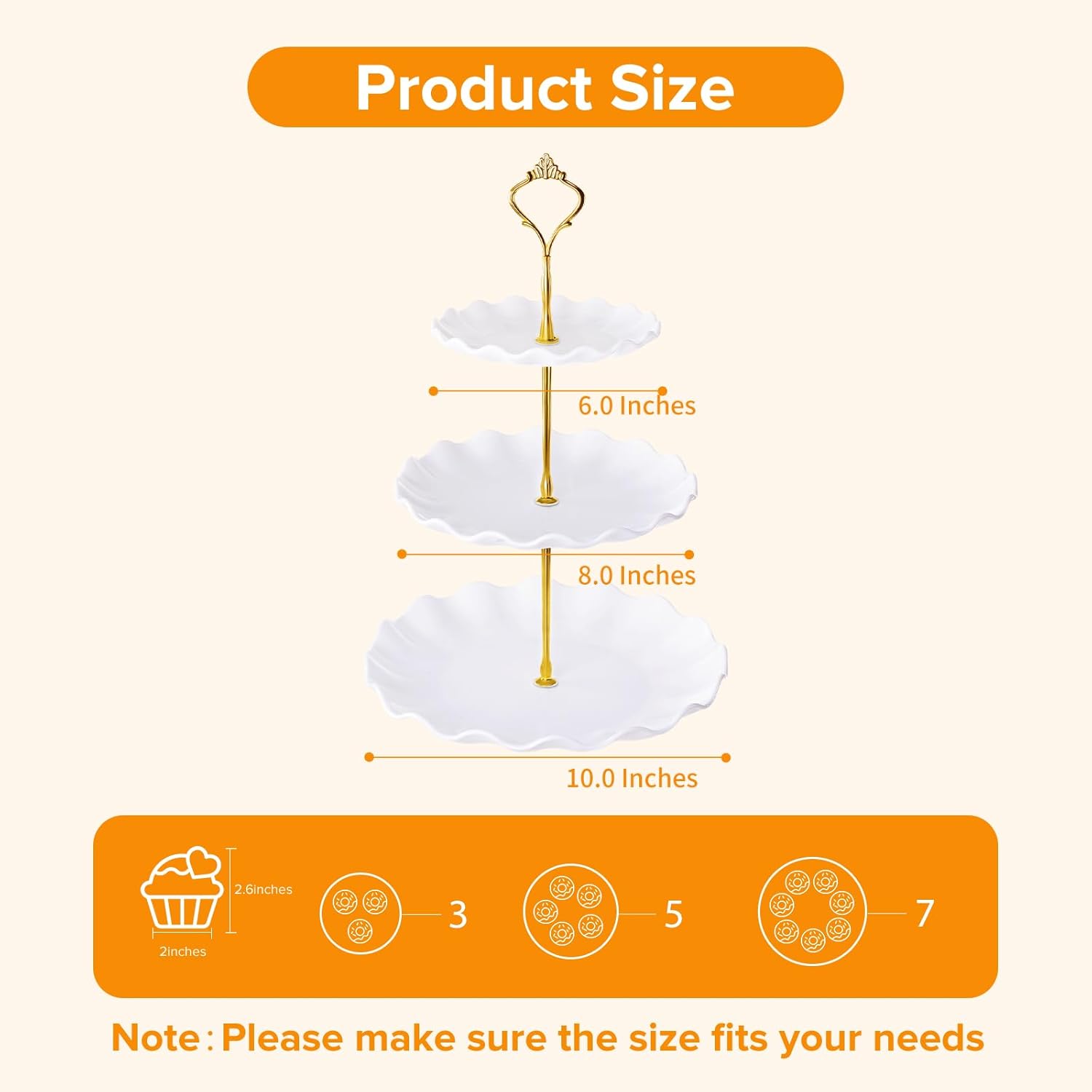 - Design to Hold 15 Cupcakes: The 3 tier serving trays measure 5.7, 7.7, and 9.5 inches in diameter, with a height of 13 inches. It can hold up to 15 standard cupcakes. Please ensure the size fits your needs before purchasing