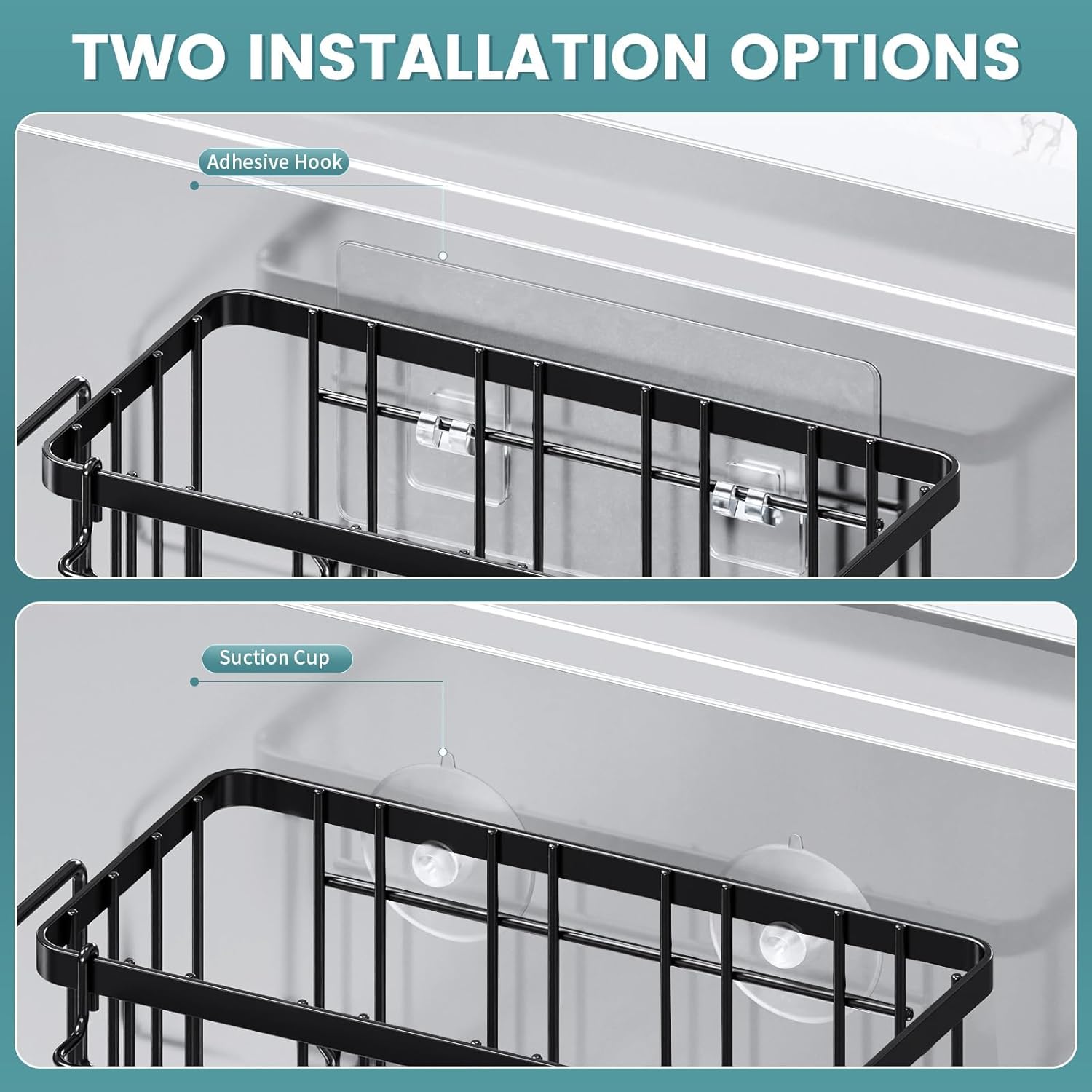 - 【Two Installation Options】Provides two installation options for the sponge holder for kitchen sink, adhesive hooks and suction cups, so that no drilling is required. Adhesive hook provides good stability, and suction cups allow for easier removal. Installation instruction will be included with the sink caddy. Please clean the contact surface completely before installation.