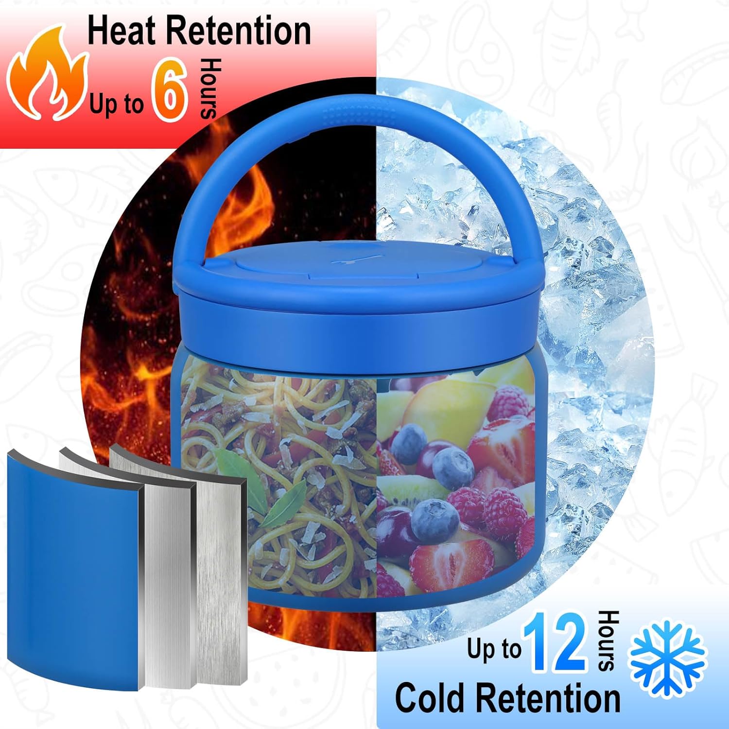 - Hot and Cold Food Thermo: This soup thermo is constructed with 18/8 (SUS304) stainless steel and vacuum insulation, keeping meals hot or cold for over 5 hours. It comes with a collapsible stainless steel spoon hidden conveniently in the lid, making it perfect for on-the-go dining.