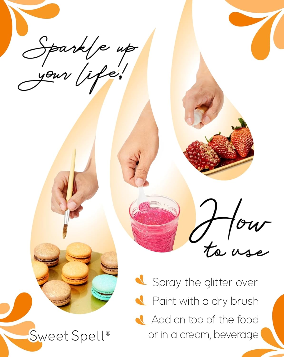 - Sparkling Drink Sensation: Elevate your drinks and cocktails with a mesmerizing glittery hurricane effect. Watch as your beverages shimmer and shine with our Sweet Spell drink glitter.