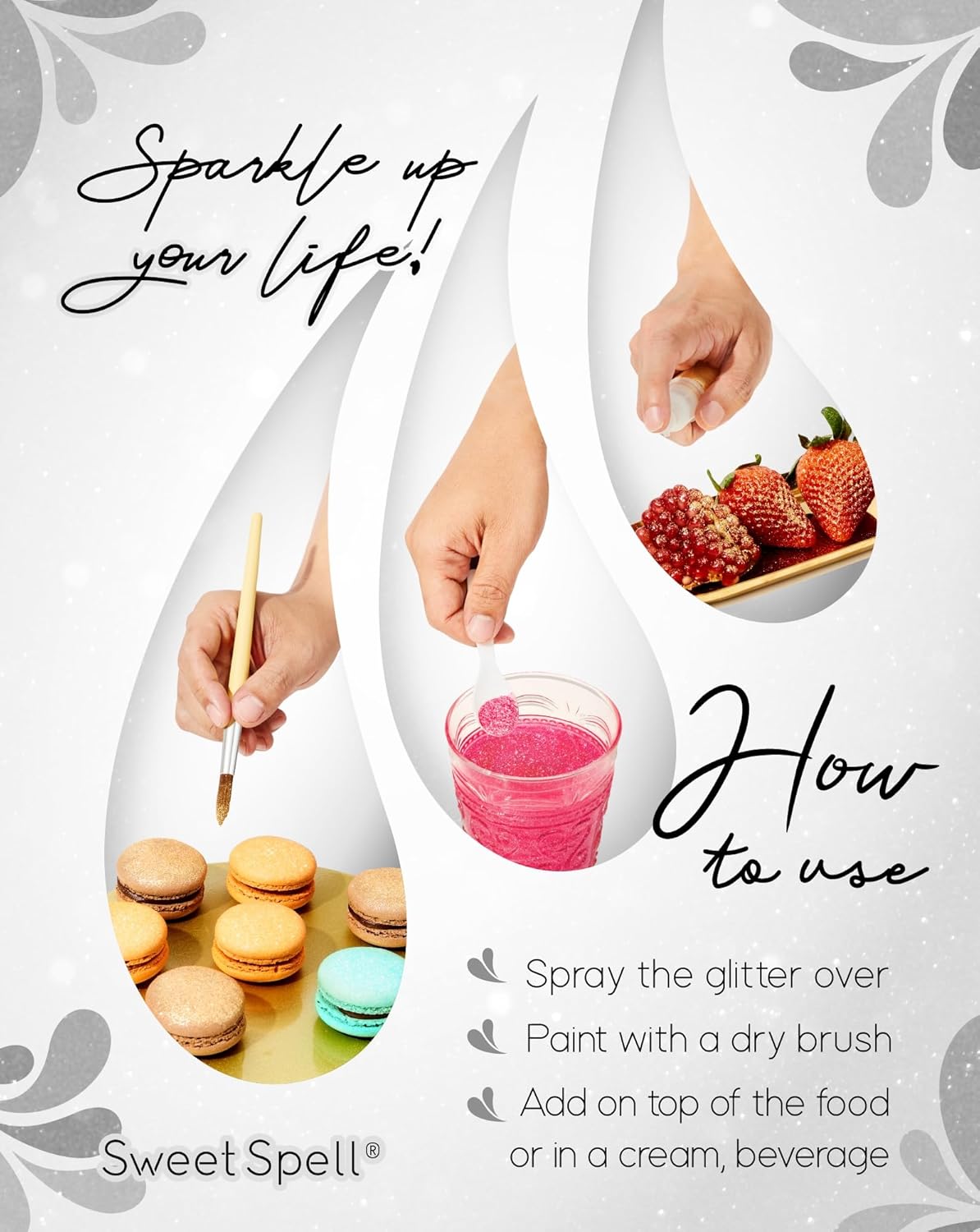 - Sparkling Drink Sensation: Elevate your drinks and cocktails with a mesmerizing glittery hurricane effect. Watch as your beverages shimmer and shine with our Sweet Spell drink glitter.
