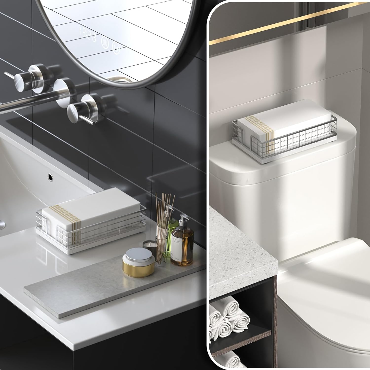 - Large Size: The dimensions of the Bathroom Napkin Holder are 9.06 x 5.51 inches, with internal dimensions of 8.66 x 5.19 inches, It is large enough to accommodate all width and length guest towels; It fits on the back of the toilet, Will use it all year