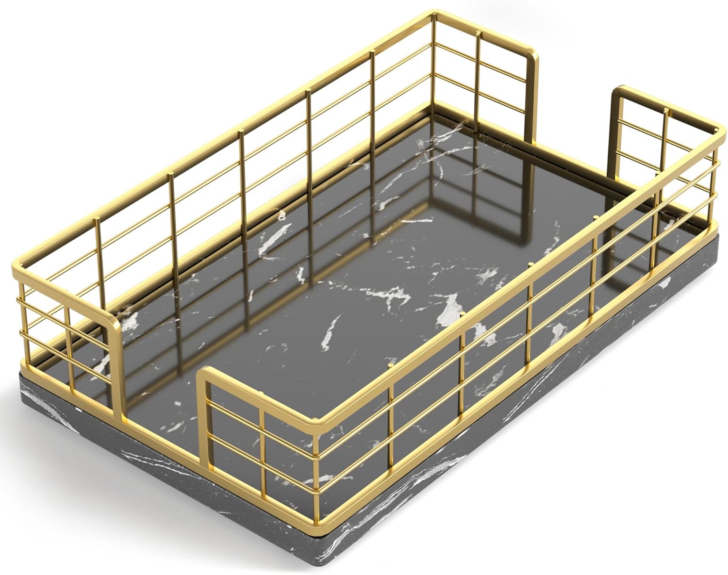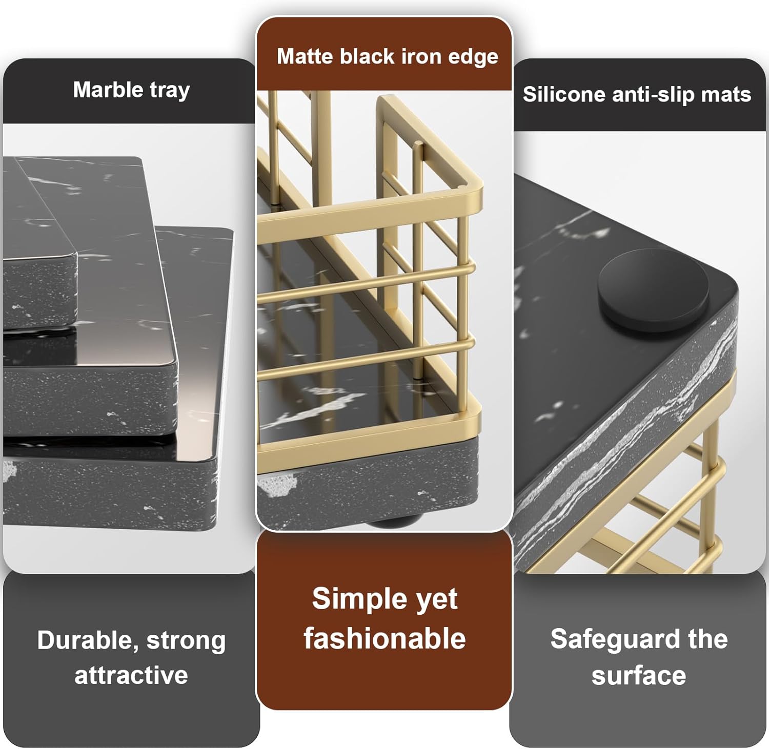 - Cost-effective: No assembly required, easy to clean. The tray crafted from iron and marble is simple and attractive. The solid bottom ensures items won't fall. With silicone non-slip pads, it provides both anti-slip functionality and better protection for surfaces