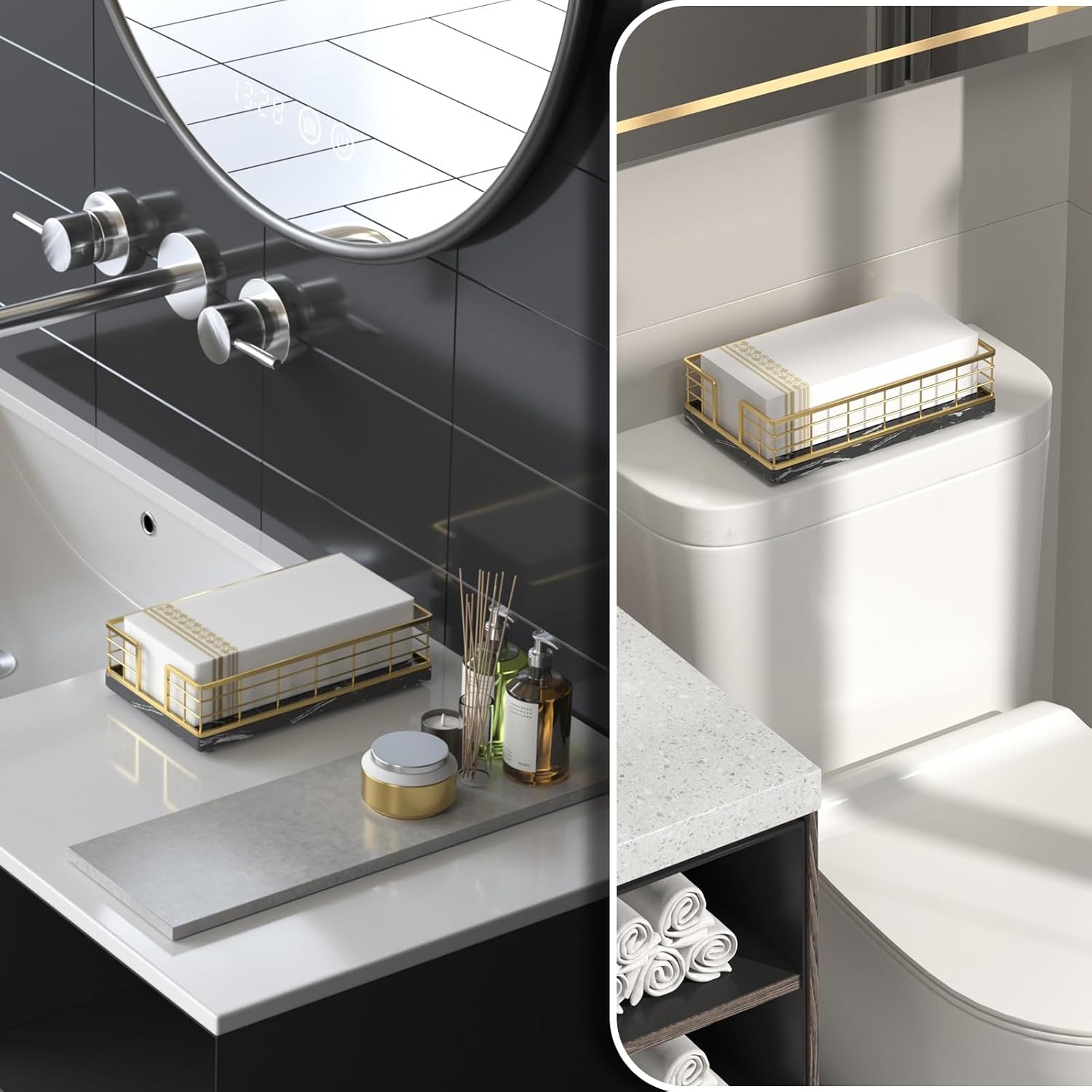 Wican Marble Guest Towel Holder Tray for Bathroom, Napkins Holder for Powder Room Dinning Table Wooden Basket for Disposable Paper Hand Towels Gold and Marble Black