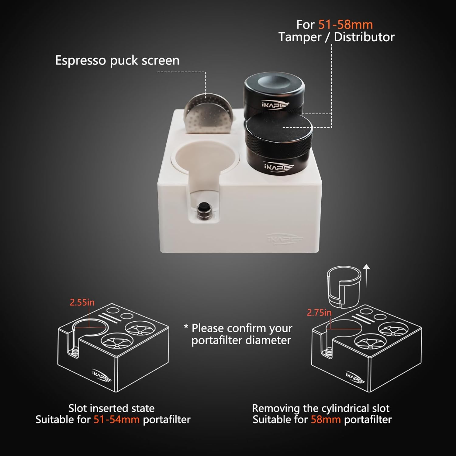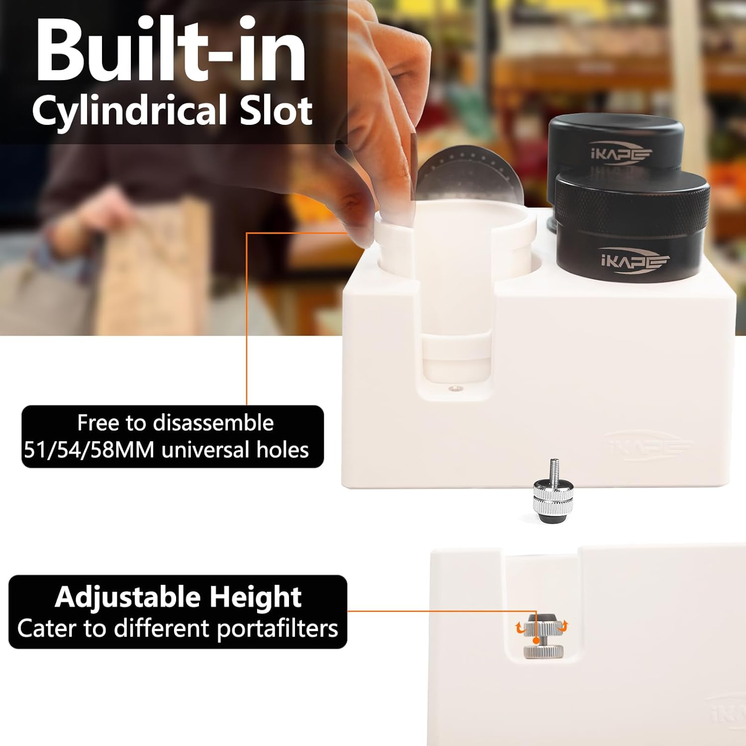 - 7-in-1 Multifunctional Design - IKAPE ABS espresso knock box, it is not only compact, but also has 7-in-1 multi-functional storage space, whether it's tamper, distributor, portafilter, puck screen or cleaning brush, this espresso coffee organizer box can be perfectly stored. It is customized for coffee accessories from 51-58mm in size, and makes it easy to distribute and tamp the coffee powder