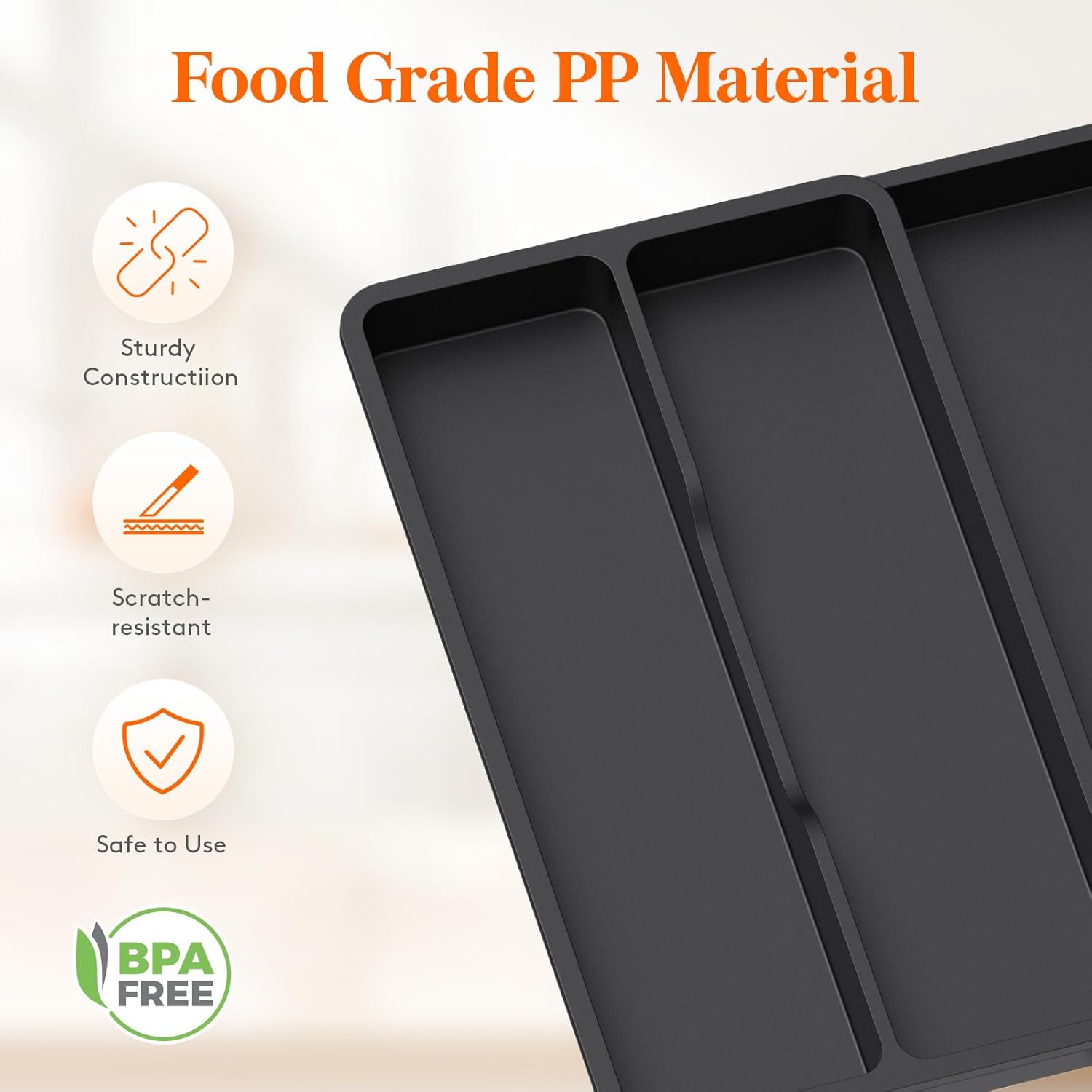 - Robust and Safe: This kitchen drawer organizer is crafted from premium PP material, BPA-free and built to last. It ensures your silverware is stored in a healthy, safe environment for worry-free use