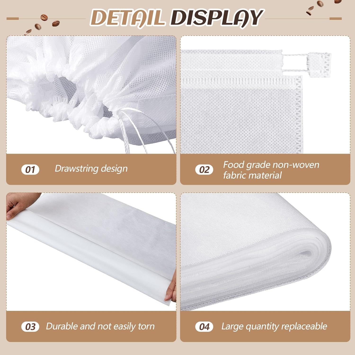 - Easy Maintenance: our cold brew filter bags offer the advantage of easy maintenance; After a brewing process, you can conveniently discard the bag together with the coffee grounds or clean it for future use, relieving you from the hassle of significant cleaning tasks, also specially designed with the drawstring, offering easy operation, ensuring proper closure and opening