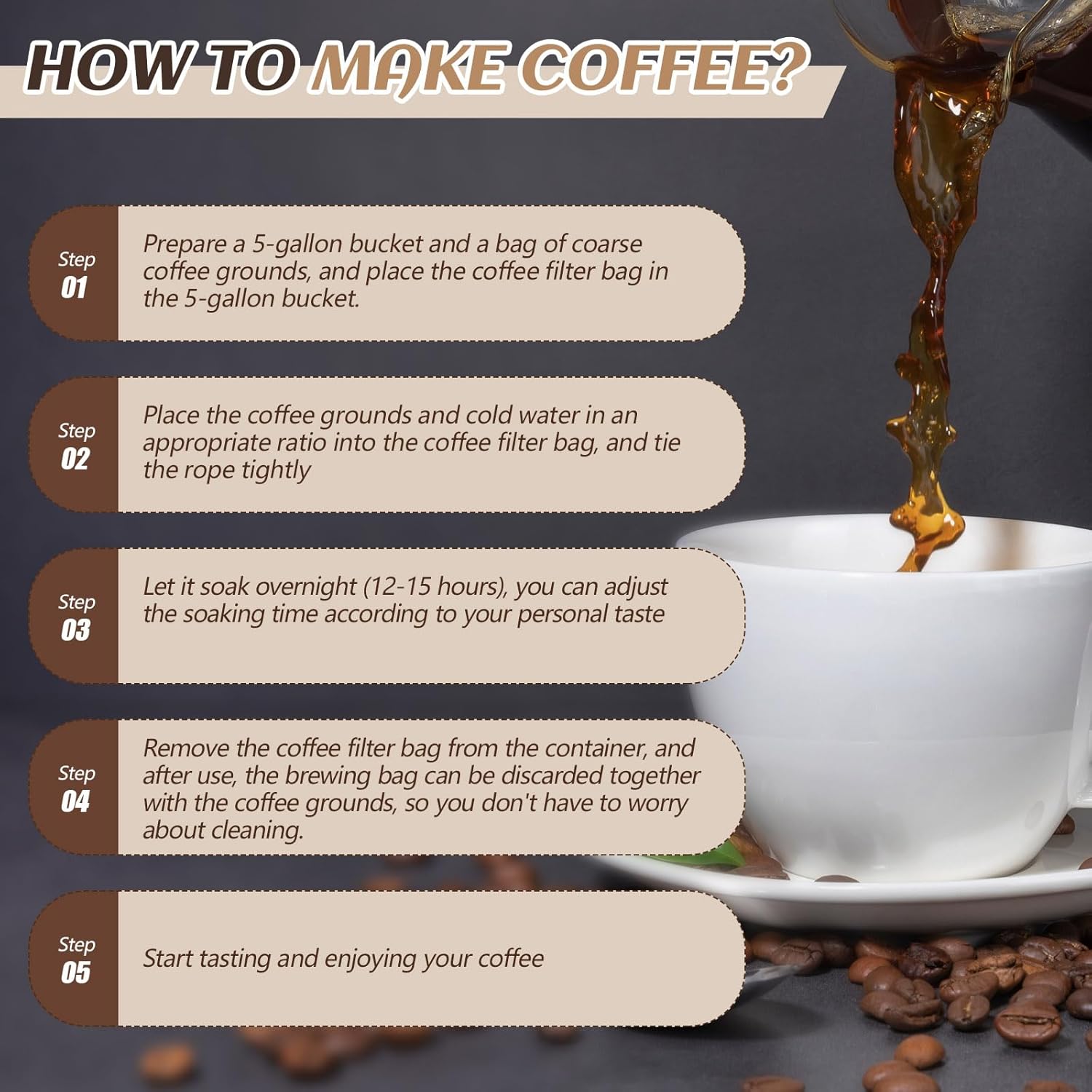 - Nice Fit for Your Brewing Needs: these coffee filter bags measure about 20 x 20 inches, can accommodate up to 5 lbs of coffee, suitable for 5 gallon buckets and commercial model cold brew coffee makers, making them ideal for both commercial and personal use; The instructions are user friendly: insert the bag in a 5 gallon bucket, add coffee, water, and let it steep overnight for a refreshing cold brew