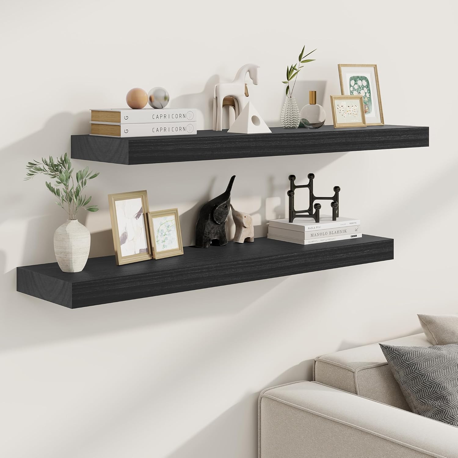 - 【DECORATIVE & FUNCTIONAL】The wall-mounted floating shelves are designed for decoration and storage, utilizing and decorating any space in your home. Used as shelf decor to show your collection, books, or prize, the hanging shelves are perfect for displaying your photo frame, small plants, model, or audio in your living room, office, study. And can also use as over the toilet storage shelf in the bathroom to hold toiletries or used as kitchen shelf to storage condiments.