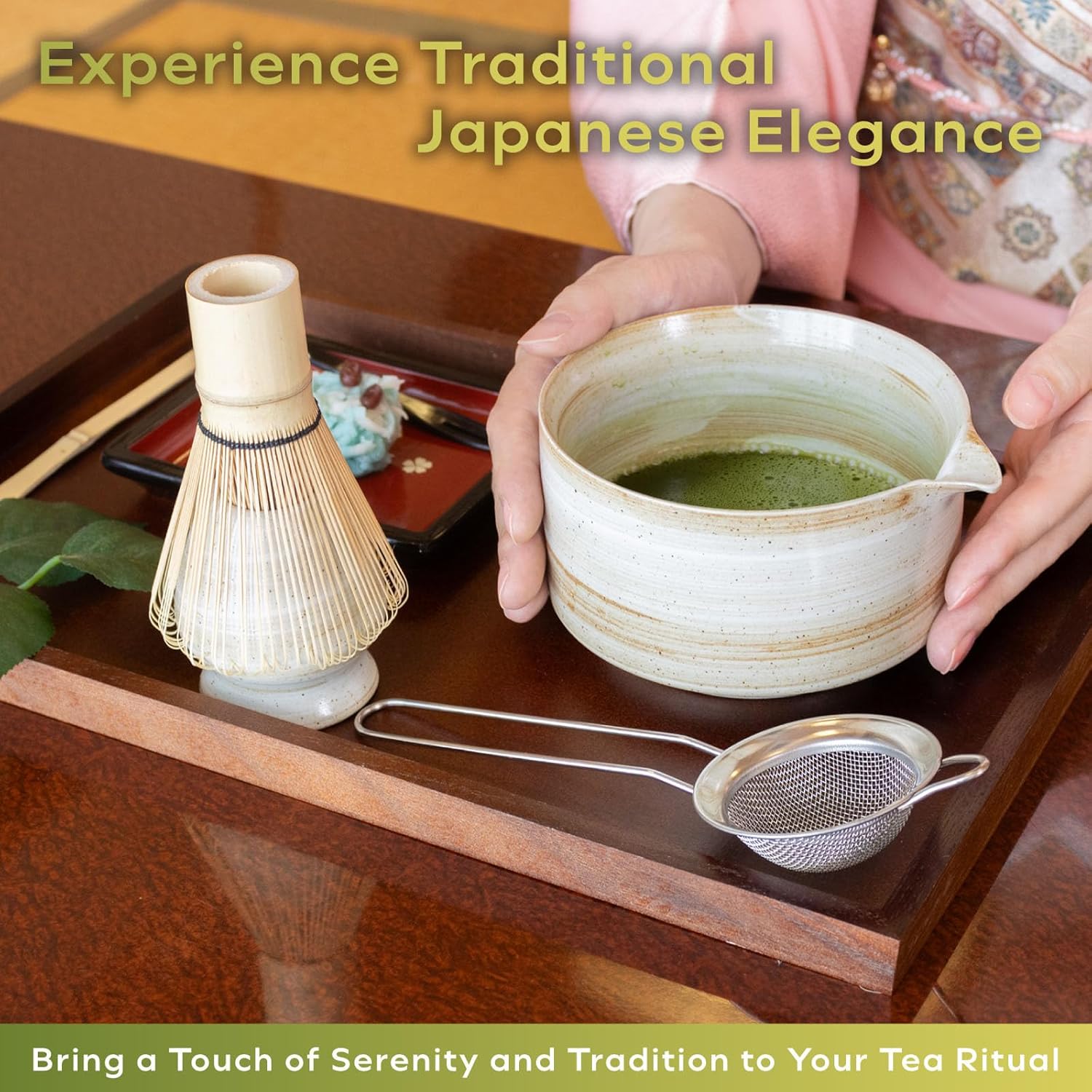 Japanese Matcha Set | Matcha Bowl with Spout | Whisk & Holder | Bamboo Scoop & Stainless Sifter | 5-Piece Traditional Matcha Kit | Designed in Japan |「Rustic Beige」