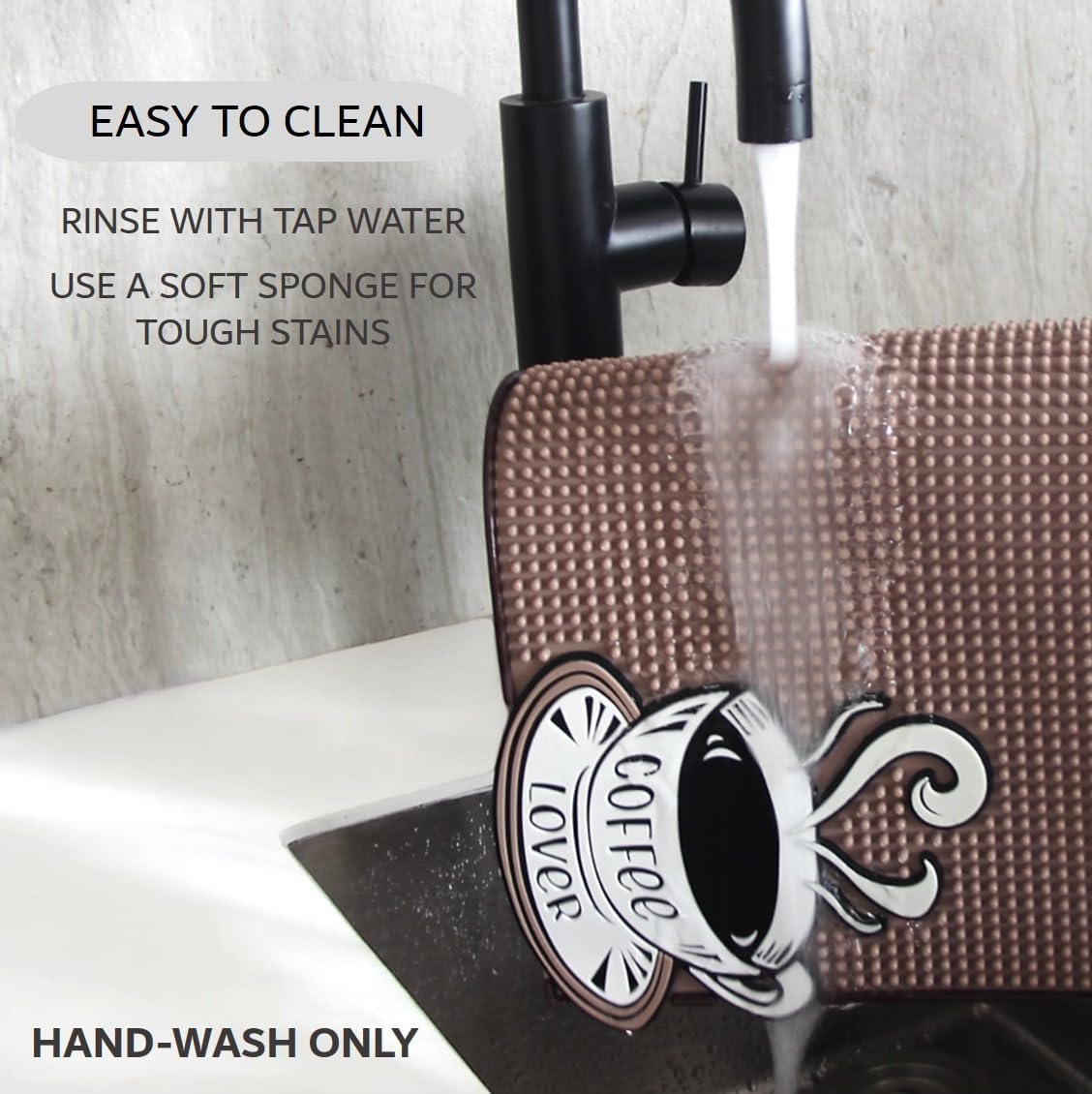 - EASY TO CLEAN: Maintain a spotless coffee station with minimal effort. Rinse the coffee pad with warm tap water, gently scrub stubborn stains with a soft sponge if needed. Important: Handwash only in order to prevent damage and preserve coffee mats design. No dishwasher safe.