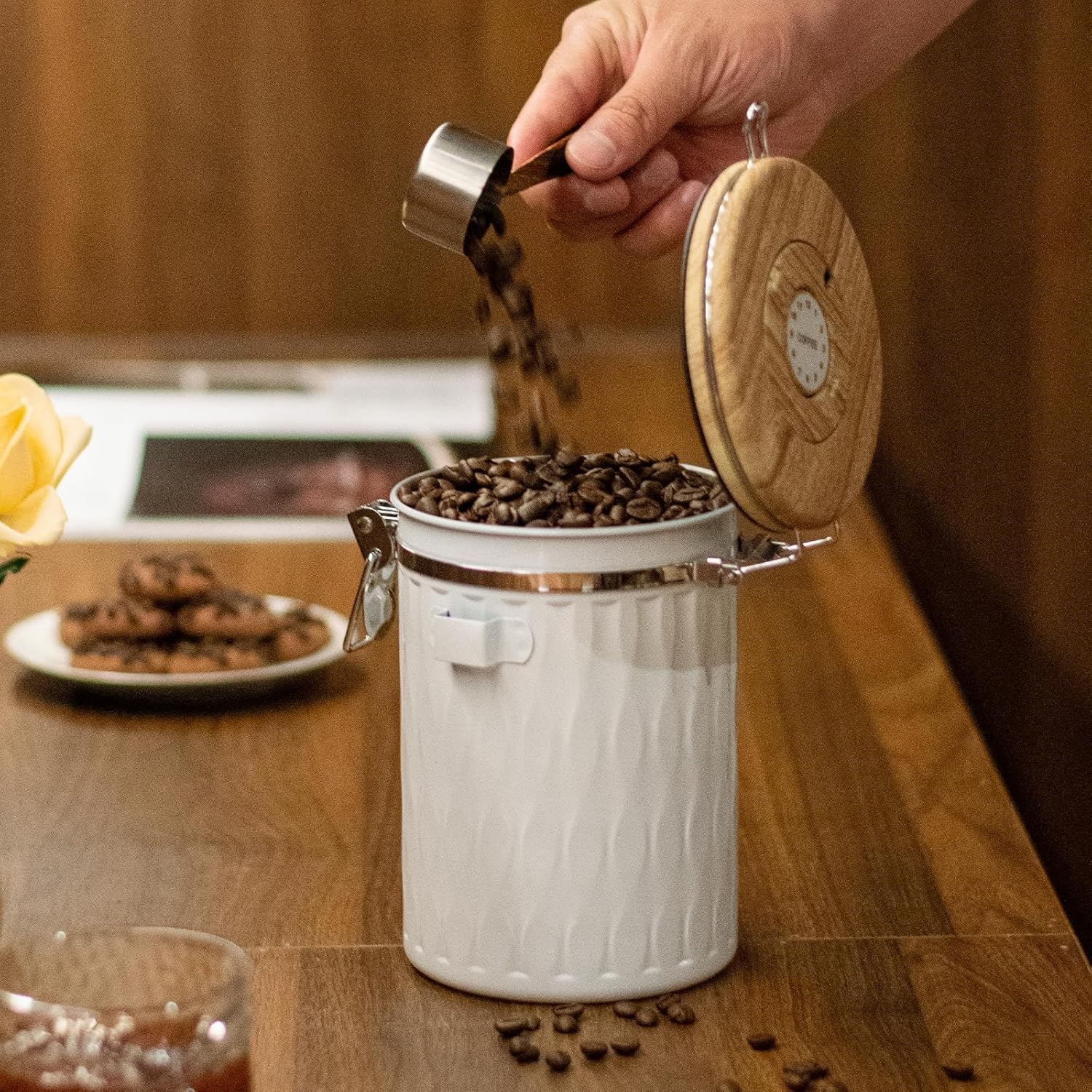 - 【Date Tracker & Free Scoop】: Ensure your coffee is always fresh and not expired. You can set the storage or expiry dates with the date tracker on the lid of your coffee storage canister. We also offer a free stainless steel coffee scoop, which can be attached to the hook!