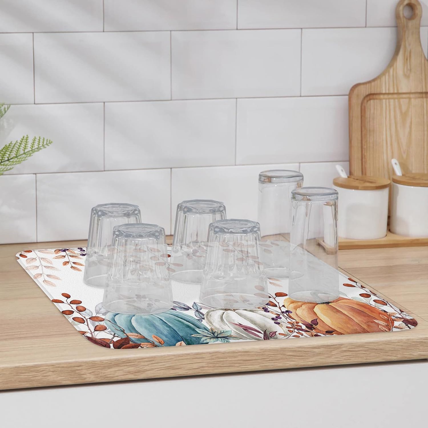 Fall Dish Drying Mat for Kitchen Counter Pumpkin Drying Pad Absorbent Drying Mats for Countertops Sinks Draining Racks Autumn Eucalyptus Leaves Drainer Holiday Harvest Thanksgiving Decorations 18x24