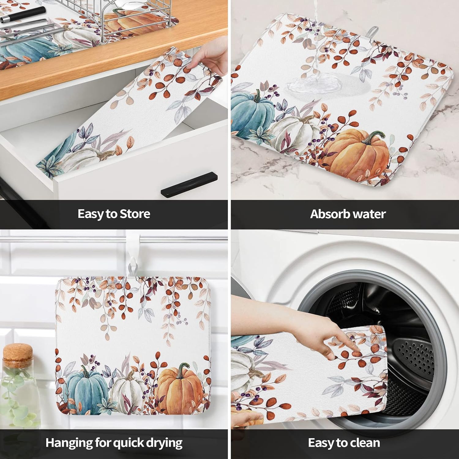 - Fall & Thanksgiving Decor - Pumpkin with eucalyptus leaves drying mats can add an chic holiday vibe and charm to your kitchen or coffee bar counter. The drying mat for kitchen counter with a unique hanging rope design that can be hung without occupying any space.