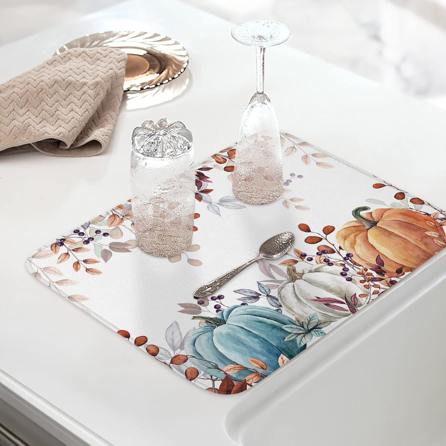 Fall Dish Drying Mat for Kitchen Counter Pumpkin Drying Pad Absorbent Drying Mats for Countertops Sinks Draining Racks Autumn Eucalyptus Leaves Drainer Holiday Harvest Thanksgiving Decorations 16x18