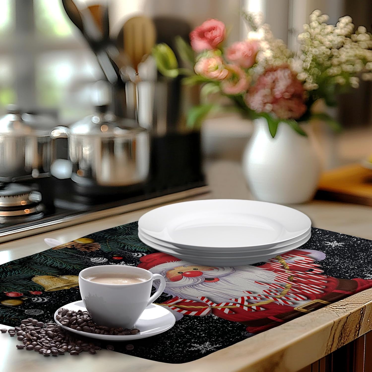 - [Quick Absorption]: Made of absorbent material, our santa claus Christmas dish dryer mat for kitchen absorbs water stains quickly, keeping your table top dry and clean, avoiding water stains and leaks, providing you with a pleasant and dry dining or working experience.