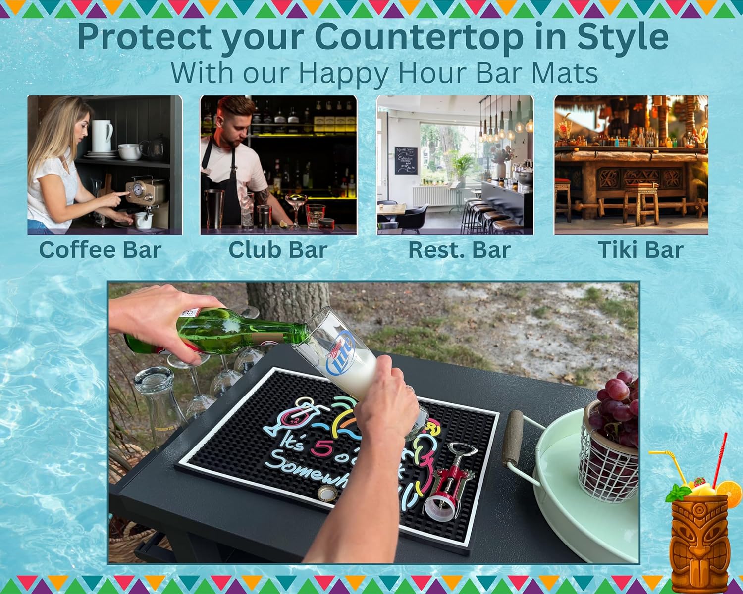 - A Reminder to Unwind: Our It's Five O'Clock Somewhere rubber bar mats for countertop serves as a hilarious and constant reminder that it's never too early or too late for a refreshing beverage. Embrace the spirit of relaxation and let the good times flow with our bar top mat happy hour sign!
