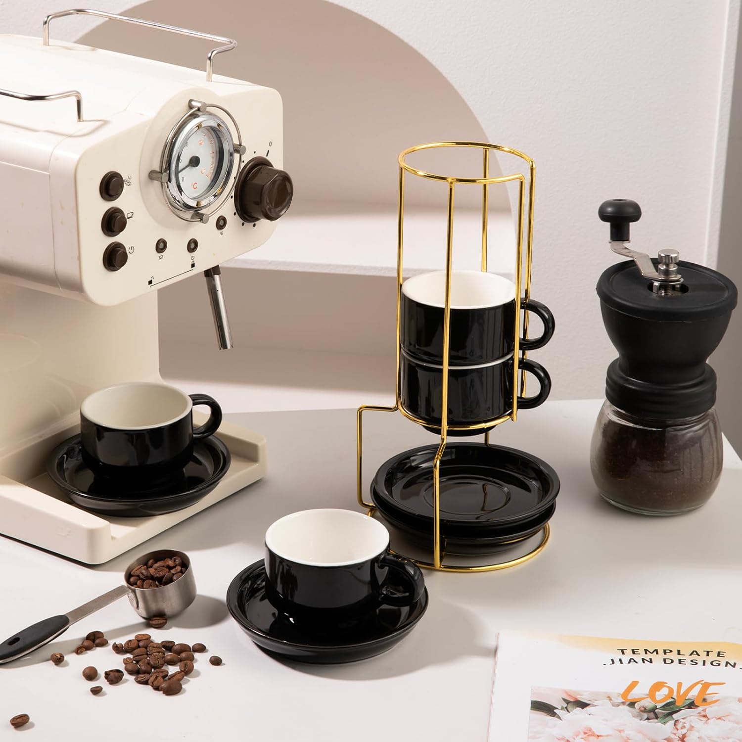 - Elegant Design - The set consists of 4 coffee cups (4 oz), 4 plates and a metal frame. Multiple colors. The cups were neatly stacked on metal shelves. It's elegant by the coffee machine.