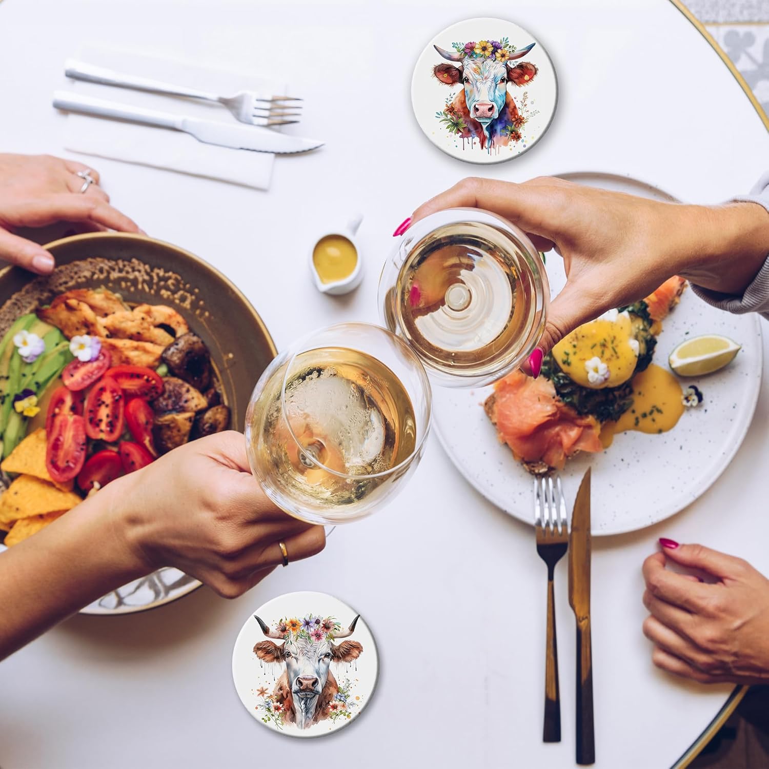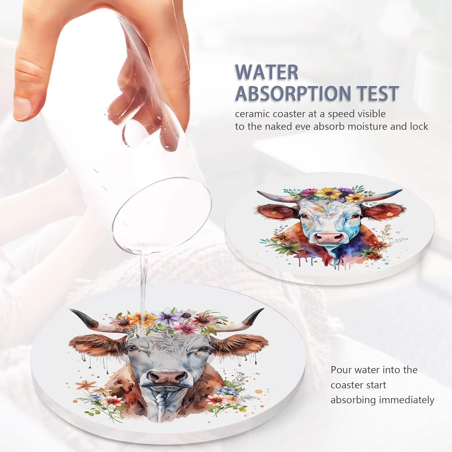 - Husiti Ceramic Coasters Set With Metal Holder: Keep Your Dining Table Stylish And Organized With This Set Of 6 4-Inch Round Coasters Featuring a Trendy Highland Cows Flowers Pattern.