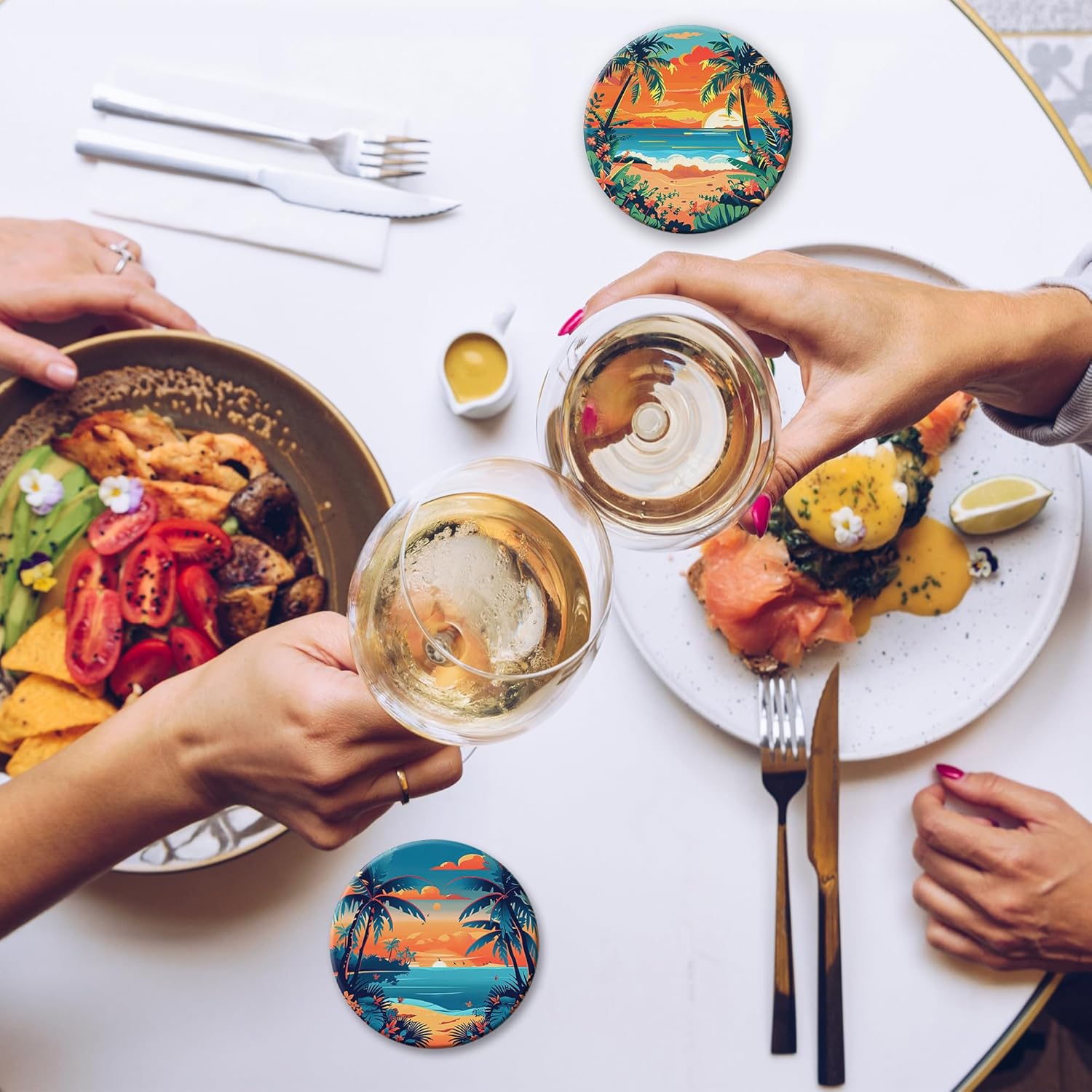 - Husiti Ceramic Coasters Set With Metal Holder: Keep Your Dining Table Stylish And Organized With This Set Of 6 4-Inch Round Coasters Featuring a Trendy Palm Trees Beach Sunset Pattern.