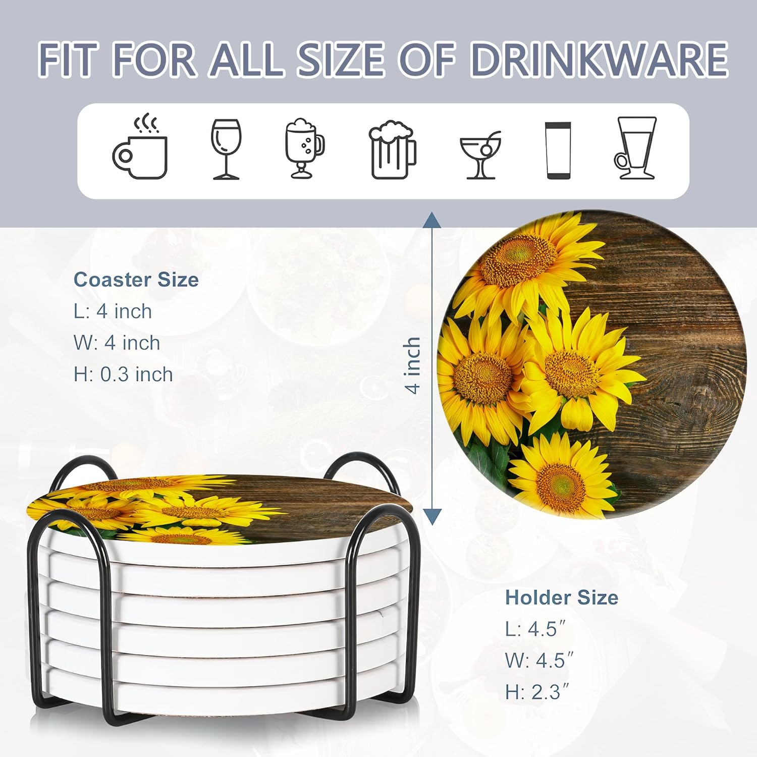 - Husiti Ceramic Coasters Set With Metal Holder: Keep Your Dining Table Stylish And Organized With This Set Of 6 4-Inch Round Coasters Featuring a Trendy Vintage Sunflower Wood Pattern.