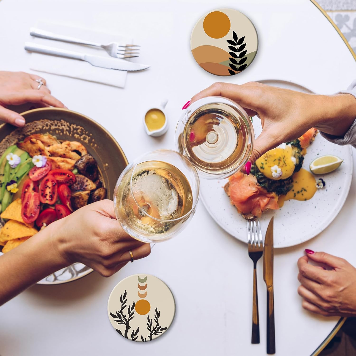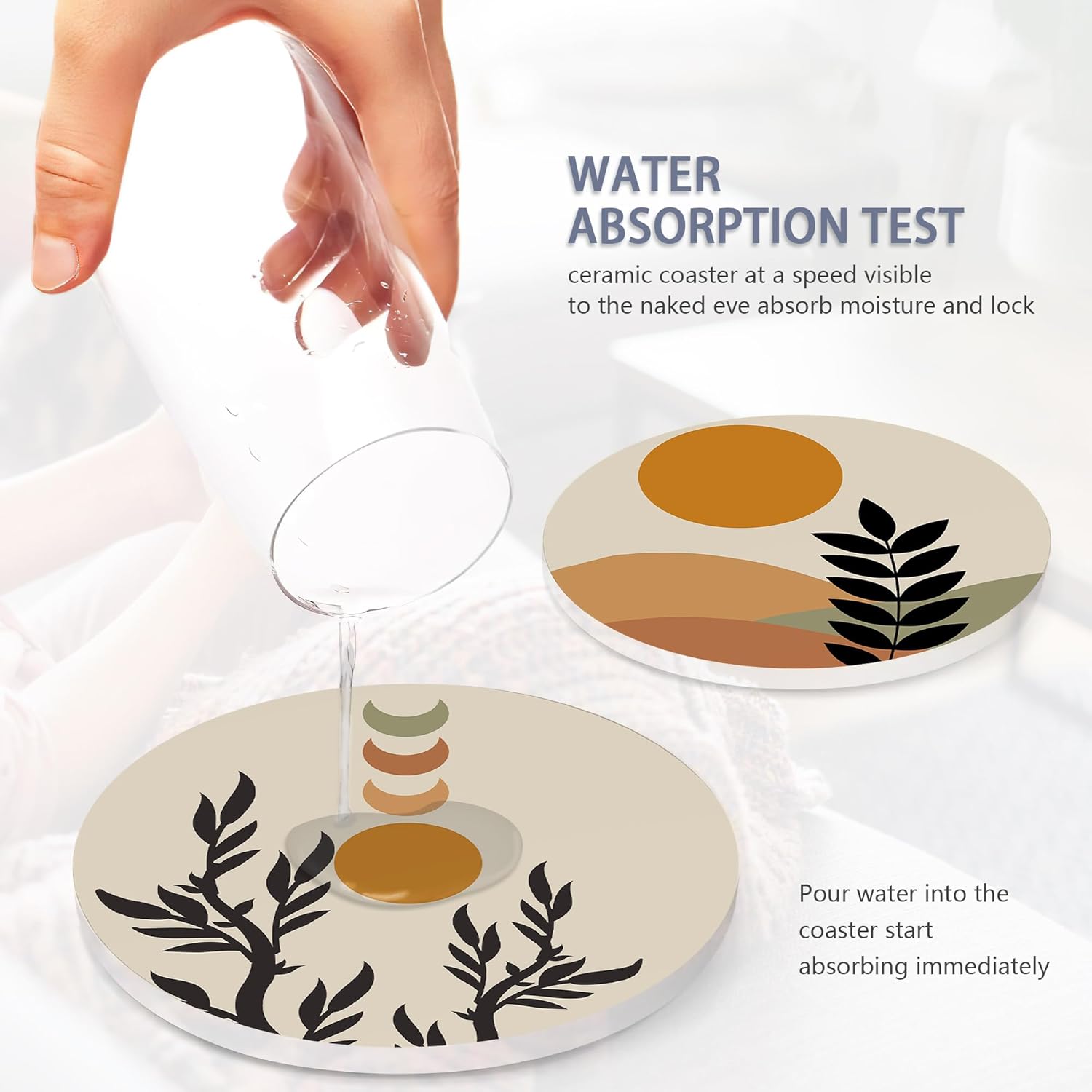 Drink Coasters Set of 6 with Holder, Abstract Boho Sun Leaves Absorbent Ceramic Coasters with Cork Base,Fit All Cups,Great Gift for Housewarming,Room Decor,Bar,Holiday Party
