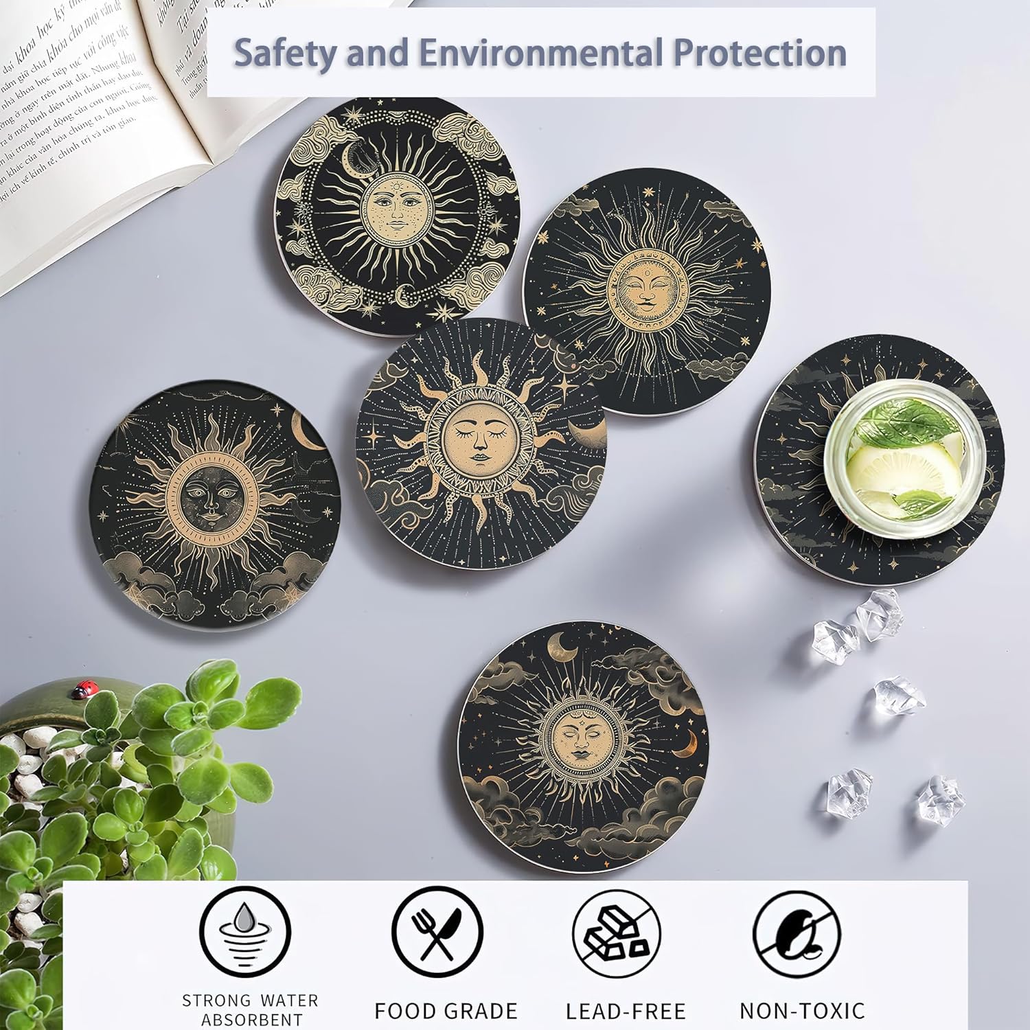 Drink Coasters Set of 6 with Holder, Gold Sun Moon Clouds Stars Absorbent Ceramic Coasters with Cork Base,Fit All Cups,Great Gift for Housewarming,Room Decor,Bar,Holiday Party