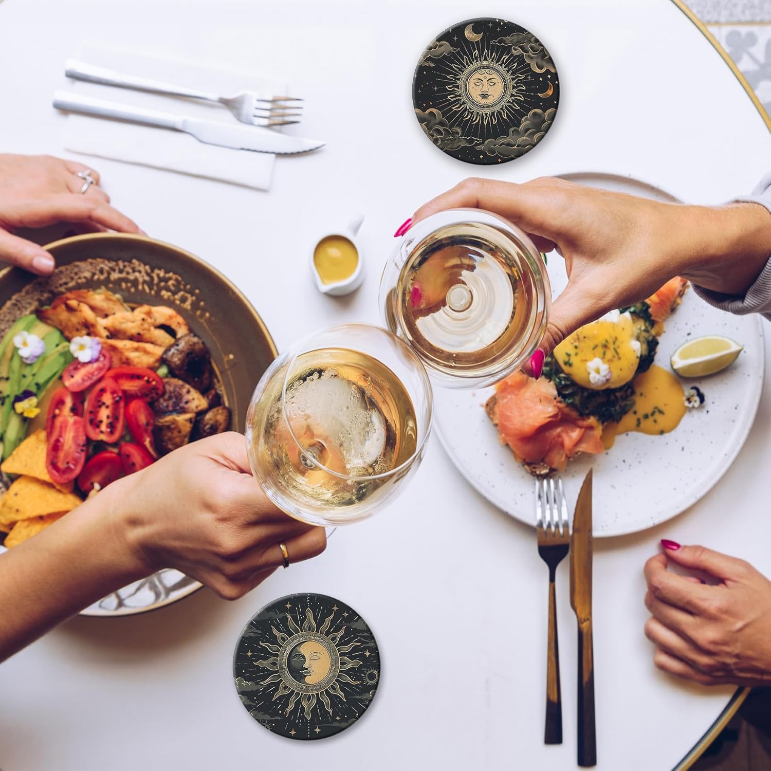 - Husiti Ceramic Coasters Set With Metal Holder: Keep Your Dining Table Stylish And Organized With This Set Of 6 4-Inch Round Coasters Featuring a Trendy Gold Sun Moon Clouds Stars Pattern.
