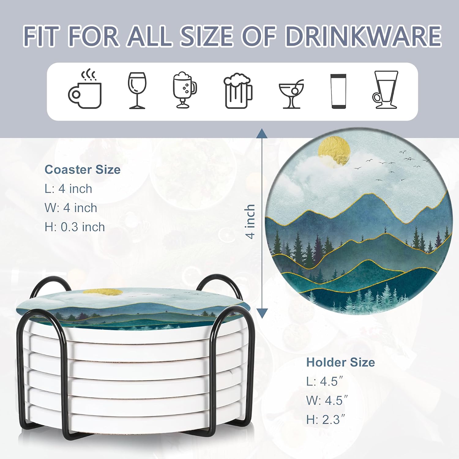 - Husiti Ceramic Coasters Set With Metal Holder: Keep Your Dining Table Stylish And Organized With This Set Of 6 4-Inch Round Coasters Featuring a Trendy Abstract Mountain Sun Pattern.