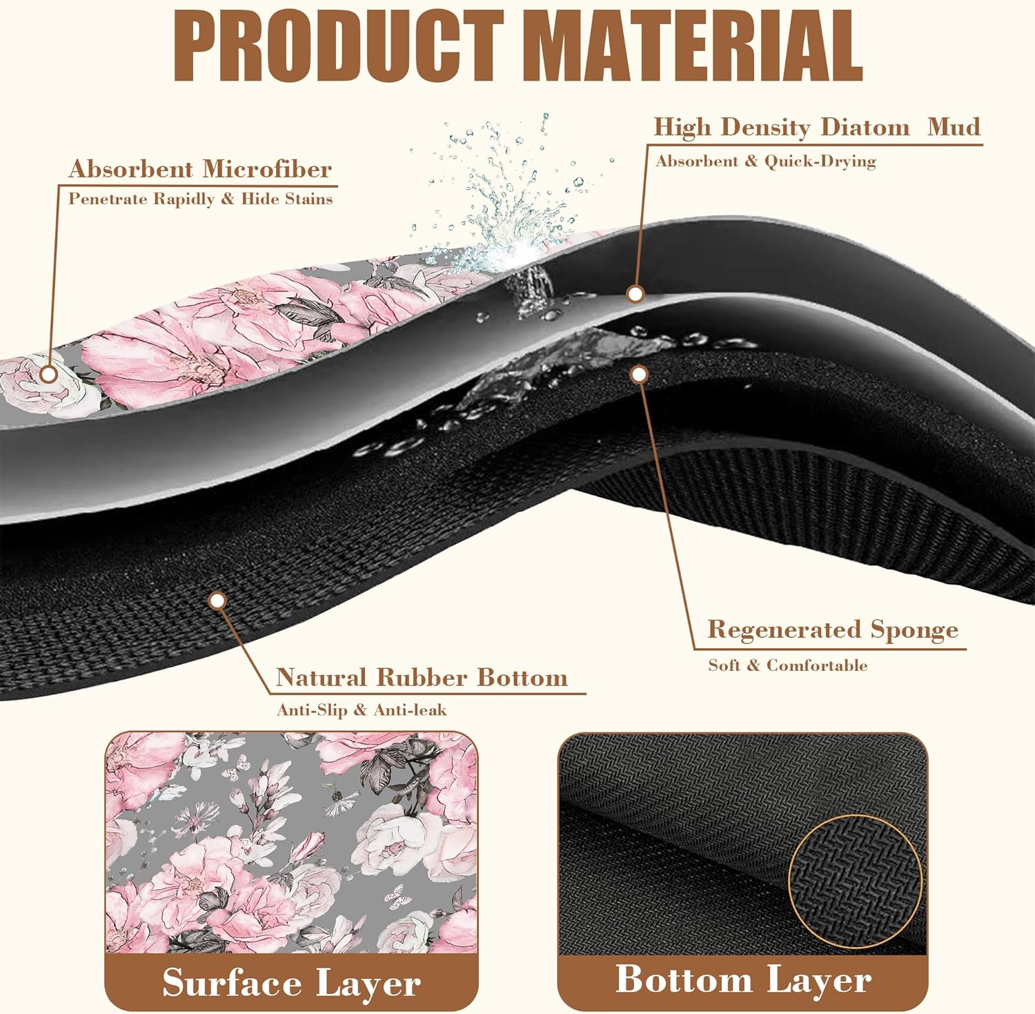 Pink Flowers and Leaves Coffee Mat Absorbent Dish Drying Mat for Kitchen Counter Hide Stain Rubber Backed Coffee Bar Accessories Fit Under Espresso Machine Dish Drainer, 15.7 x 23.6 Inch