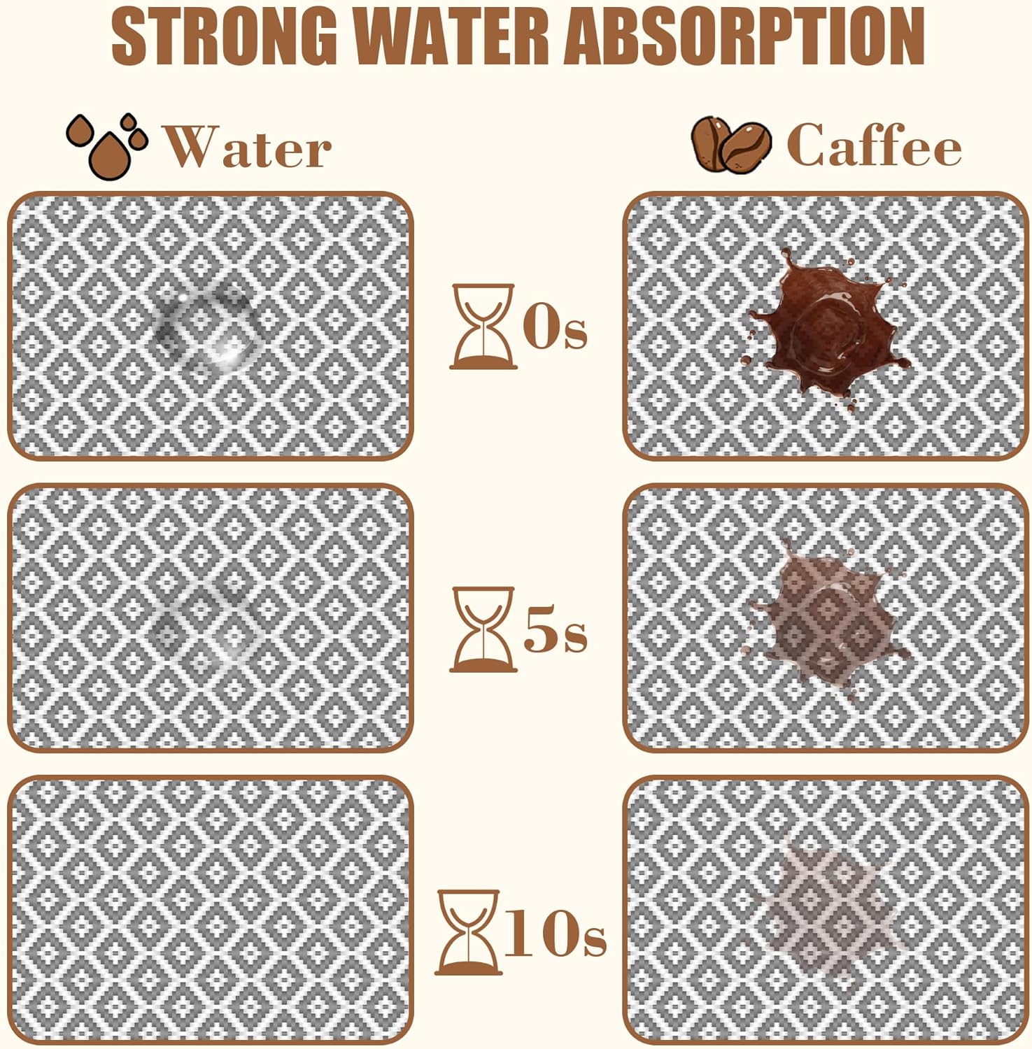 - 【Absorbent & Quick-Drying】The surface of this coffee mat is made of absorbent microfiber and the middle is made of composite sponge, which can absorb up to 4 times its weight in water and has a strong water absorption capacity. The high-density design makes it fast drying and can quickly absorb spilled liquids to keep your counter or desktop dry