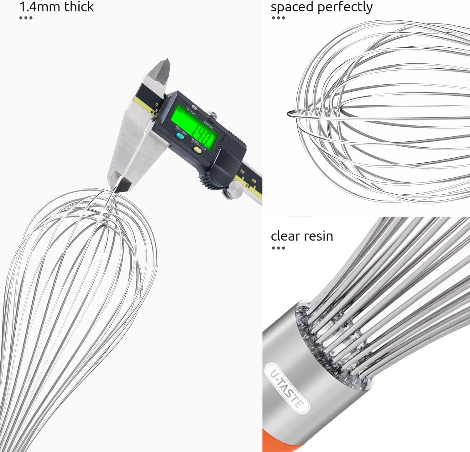 - [Sealed Up with Clear Food Grade Resin] U-Taste balloon whisk is sealed up around the base of the wires where they join the handle with food grade resin to ensure that the no food bits or water can get in or rust. You can use this metal whisk for beating, whisking and whipping task without worrying about the food get caught up in the handle and wire. The balloon shape is perfect for whisking eggs, sauces, creams, gravies and dressings and it also strong enough to beat a heavy sauce or frosting.