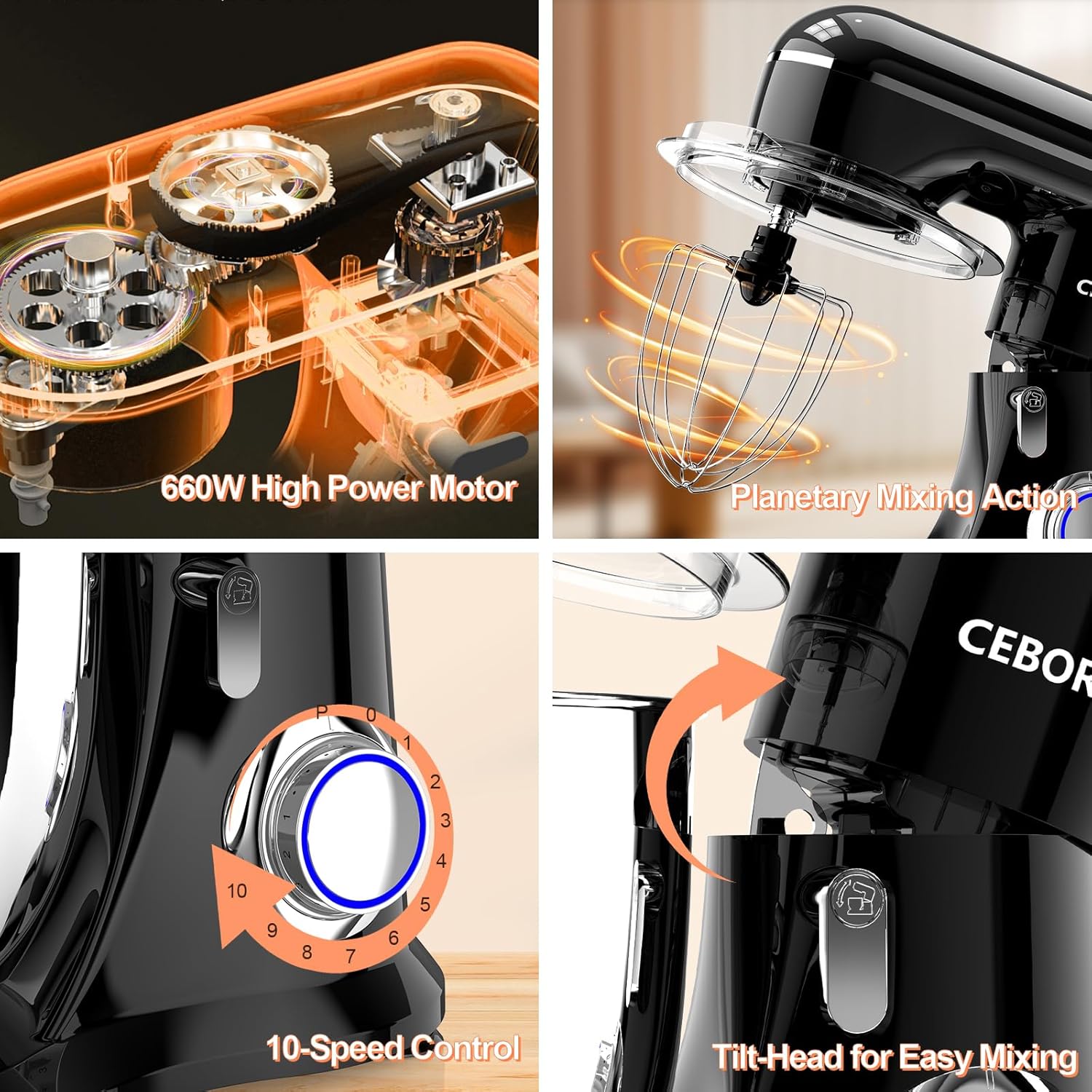 - 🍞Versatile & Efficient : CEBORY kitchen mixer boasts a multitude of functions, mixing, kneading and whisking. Featuring 10 and Pulse speed settings ranging from gentle stirring to high-speed blending - making it a powerful ally for all your culinary endeavors,such as, cakes, bread, cookies, pastry, muffins, and waffles.