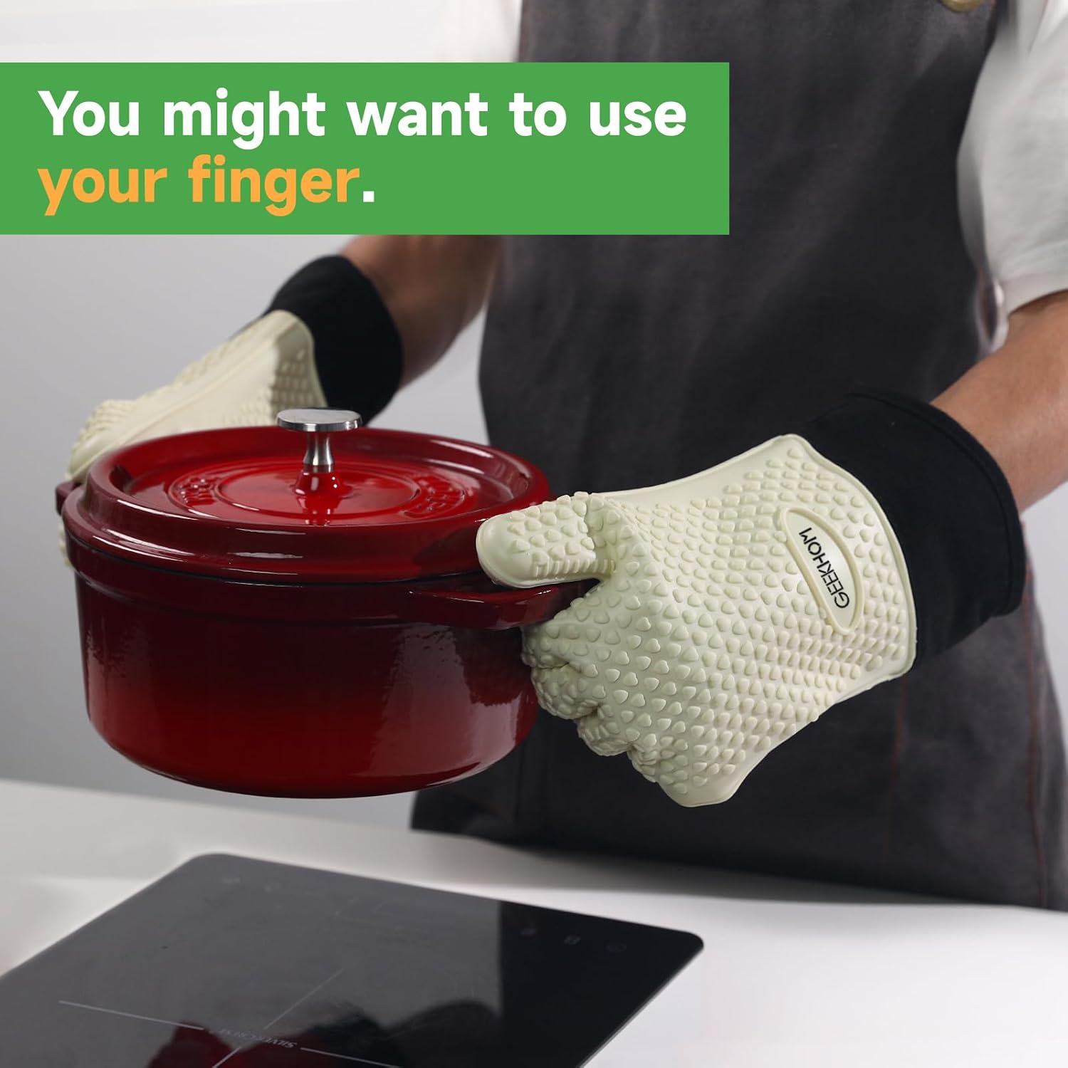 - Effortless Cleanup, Smarter Kitchen Flow: Waterproof silicone repels hot grease and marinade spills, while dishwasher-safe design erases stains in minutes; Hang the oven gloves compactly with the built-in loop—ideal for small kitchen spaces or tossing into camping gear without bulk
