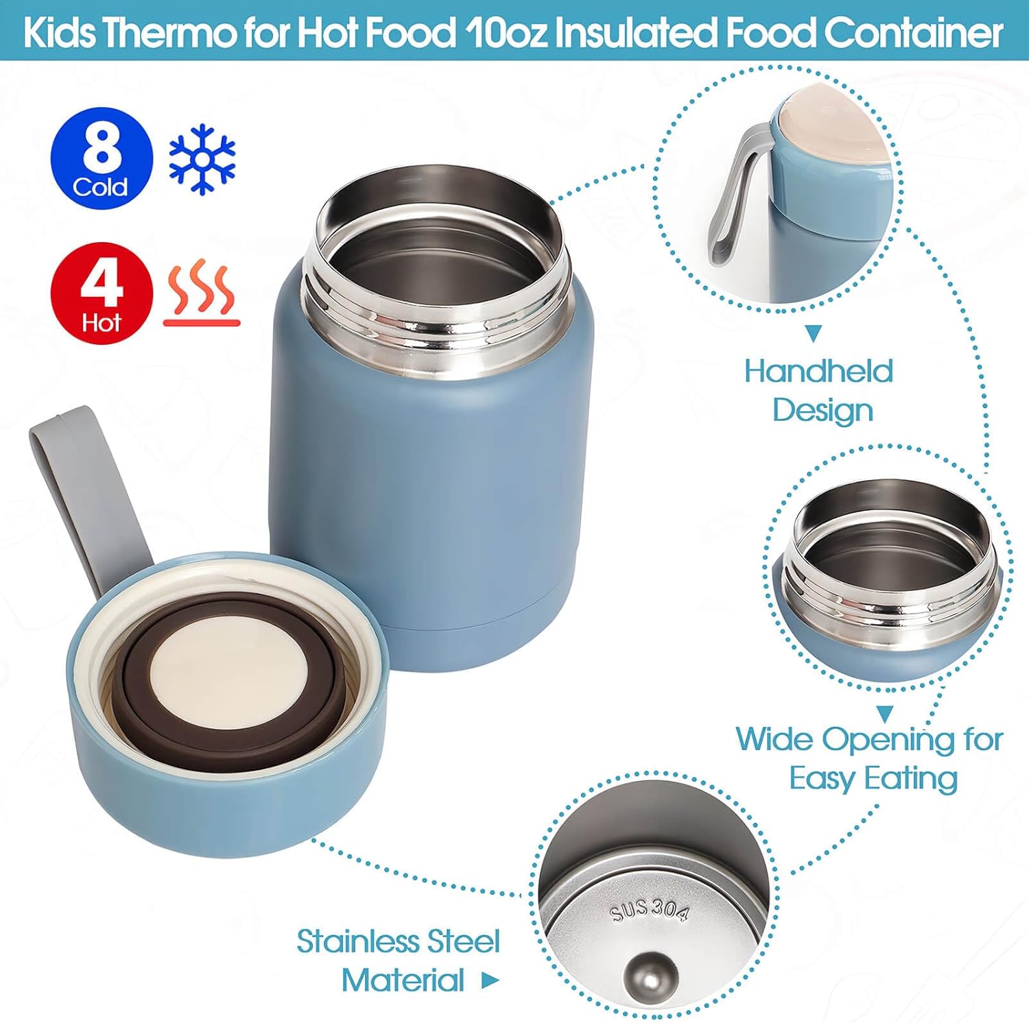- The food thermos measures 3.3 x 5.1 inches and the insulated food jar has a 10 oz capacity, big enough to hold your delicious soup or beverage. The insulated food jar is made of food-grade 304 stainless steel, which has good heat insulation and cold preservation properties.