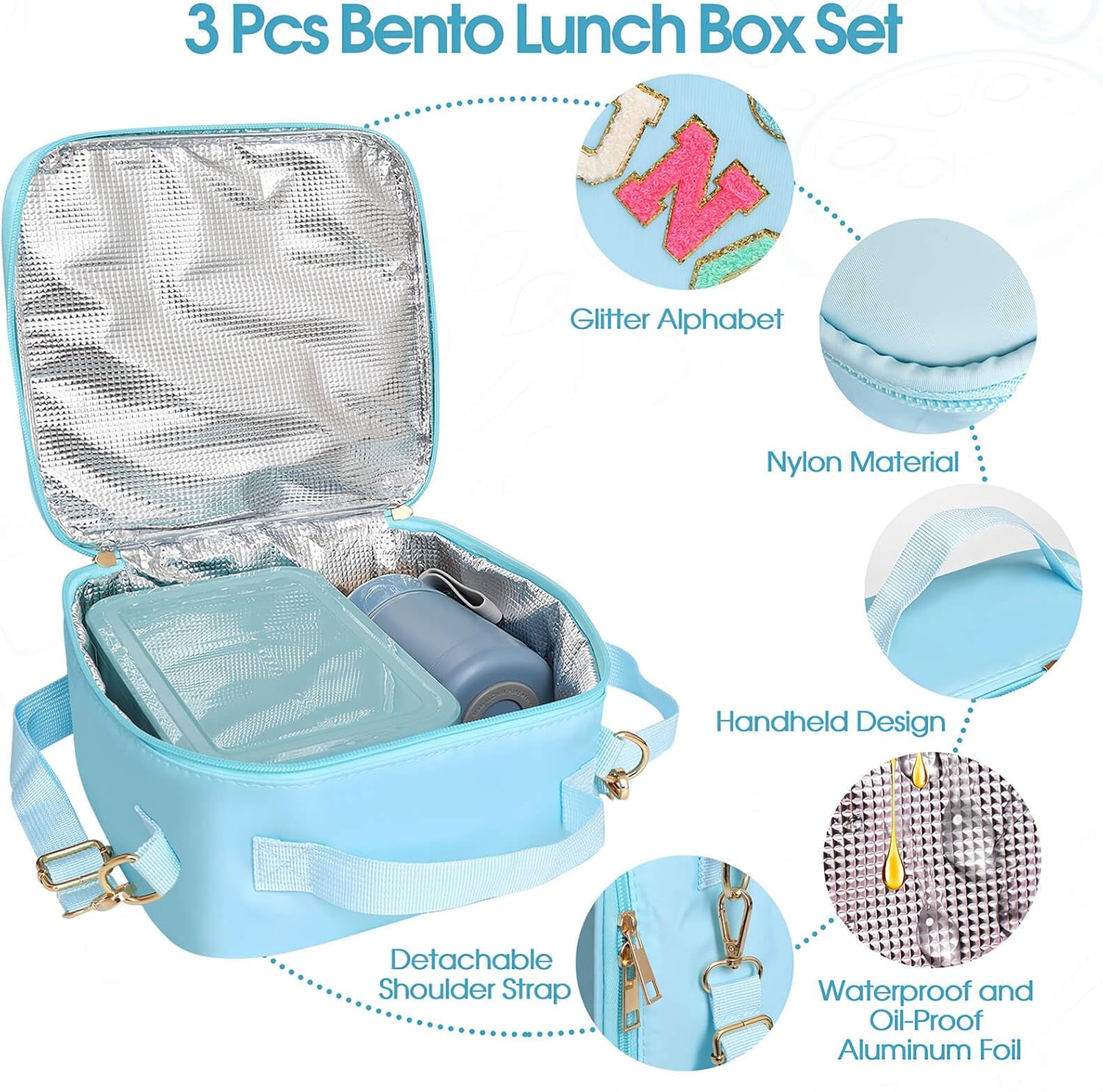 - Our blue 3 piece lunch bag set includes a preppy lunch bag, a food thermos and a double-layered bento lunch box with cutlery and sauce cups. (Age rating: 4 years and up.) Note: Thermos only be hand washed, not in the dishwasher!