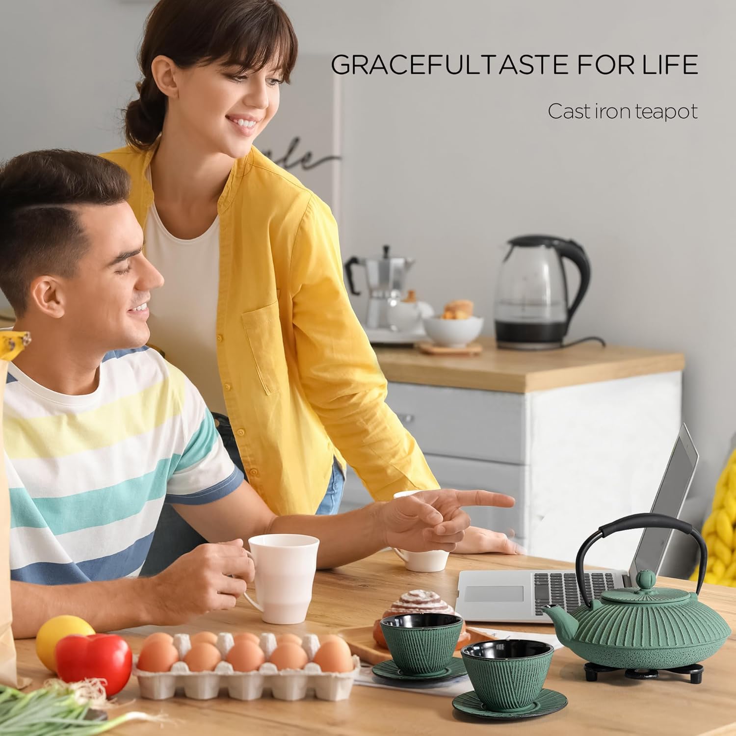 Cast Iron Teapot Set with 2 Tea Cups, 7Pcs Japanese Tea Kettle with Stainless Steel Infuser, Tea Pot Coated with Enameled Interior, Line Pattern, 27oz 780ml Green